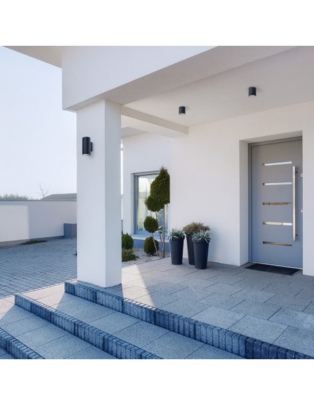 LIZZI Påbygningsspot til udendørs brug, udført i et stilrent design af antracit lakeret aluminium. Lampen måler 9 cm i diameter og anvender 1 x GU10 lyskilde (ekskl.).