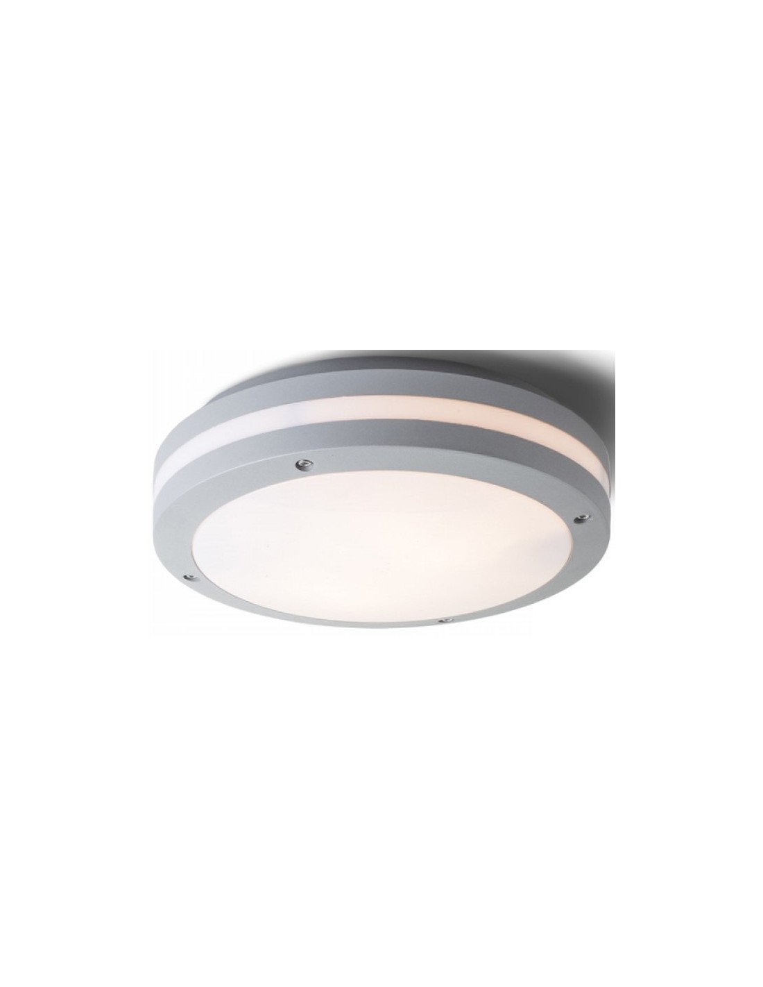 SONYA 30 loftlampe til udendørs brug, udført i et design af sølvgrålakeret aluminium og hvid akryl. Lampen måler 30 cm i diameter og anvender 2 x E27 lyskilder (ekskl.).