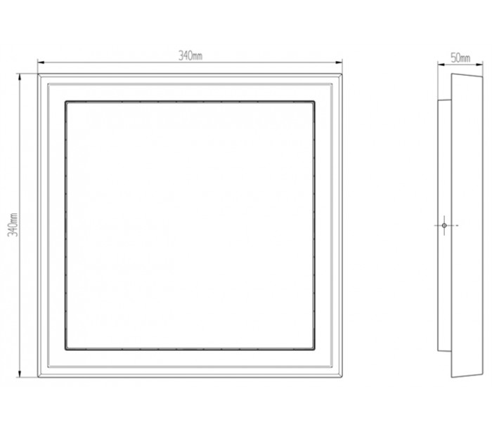 Udendørs loftplafond der også kan anvendes på væg, udført i et moderne design i mørkegrå aluminium, der let tåler at hænge ude hele året. Lampen måler 34 cm i bredde og dybde og en højde/fremspring på 5 cm. Denne udgave er med belysning i varm hvid.