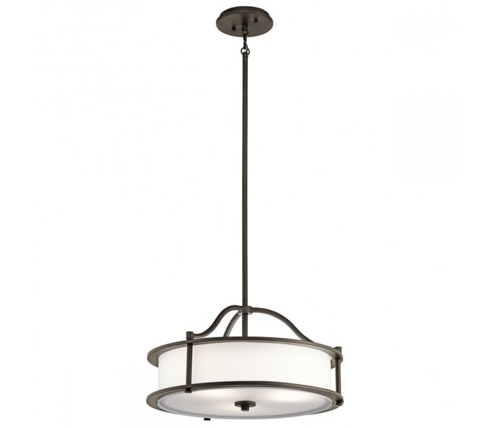 Emory pendellampe i et moderne design fra amerikanske Kichler. Lampen måler 45,7 cm i diameter og 31 - 124 cm i højden og leveres til europæisk standard til 3 x E27 lyskilder. Skærmen er fremstillet i hvid tekstil og med bund i glas.