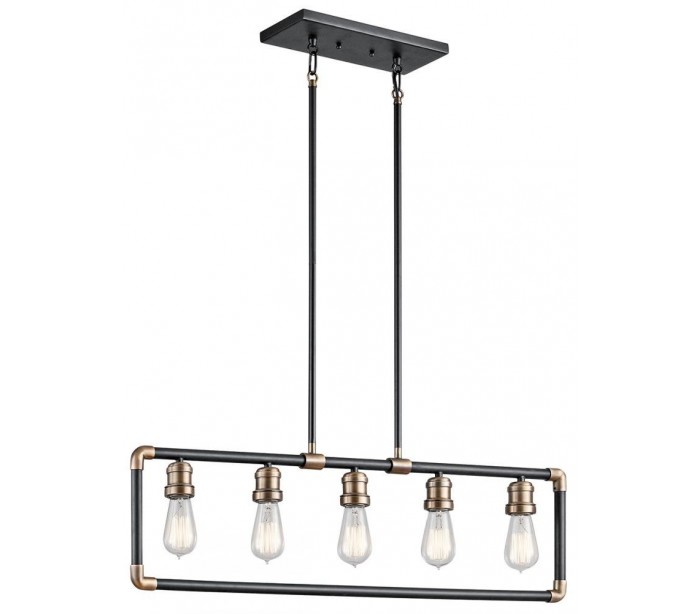 Imahn loftslampe i et industrielt design fra amerikanske Kichler. Lampen måler 90,2 cm i bredde og 55,5 - 124,5 cm i højden og leveres til europæisk standard til 5 x E27 lyskilder.