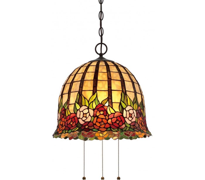 Rosecliffe pendellampe i et smukt Tiffany design, fremstillet med ramme i mørk bronzepræget keramik og skærm i farvet glas. Loftlampen måler 38,1 cm i diameter og anvender 3 x E27 lyskilder, max. 100W. Der kan anvendes LED lyskilder.