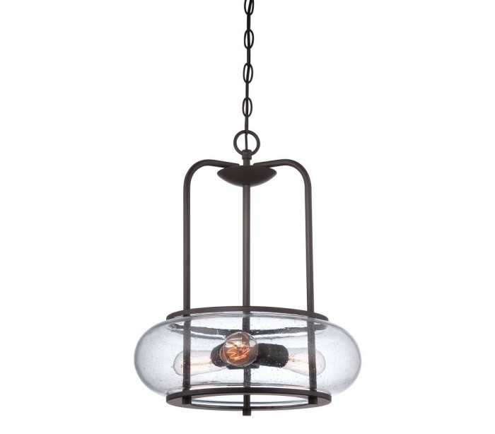 Trilogy loftslampe i et amerikansk design fra Quoizel. Lampen måler 40,6 cm i diameter og leveres til europæisk standard til 3 x E27 lyskilder. Lampen er udført i antik bronzelakeret stål og med skærm i glas.