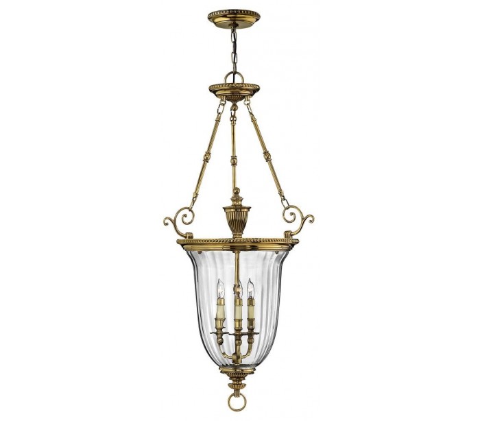 Cambridge loftlampe i et amerikansk design fra Hinkley. Lysekronen måler 57,2 cm i diameter og leveres til europæisk standard til 3 x E14 lyskilder. Lampen er udført i brændt messing og klart glas.
