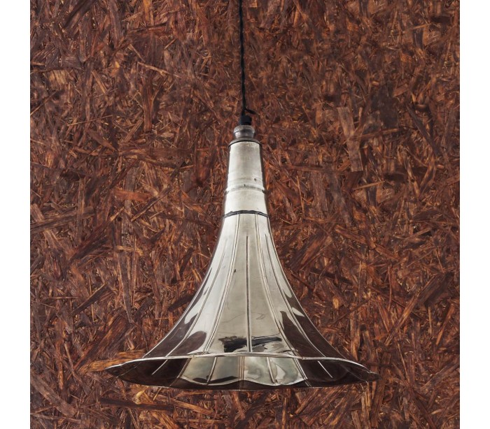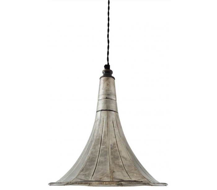 Grammophone loftslampe fremstillet i et industrielt design i antik sølvlakeret messing. Lampen måler 33 cm i diameter og anvender 1 x E27 lyskilde (Ekskl.).