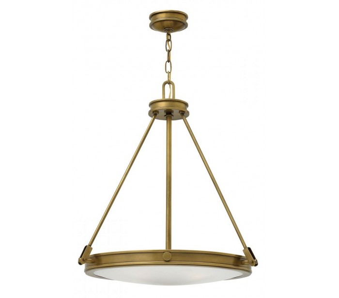 Collier loftlampe i et amerikansk design fra Hinkley. Lampen måler 54,3 cm i diameter og leveres til europæisk standard til 4 x E14 lyskilder. Lampen er udført i et design af rustik messinglakeret stål og skærm i hvid glas.