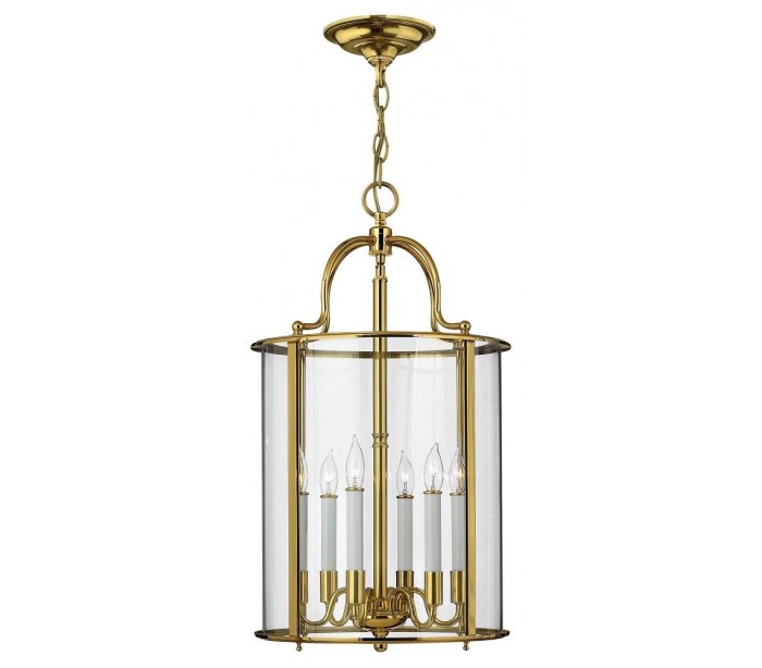 Gentry loftlampe i et amerikansk design fra Hinkley. Lampen måler 35,6 cm i diameter og leveres til europæisk standard til 6 x E14 lyskilder. Lampen er udført af poleret messing og glas.