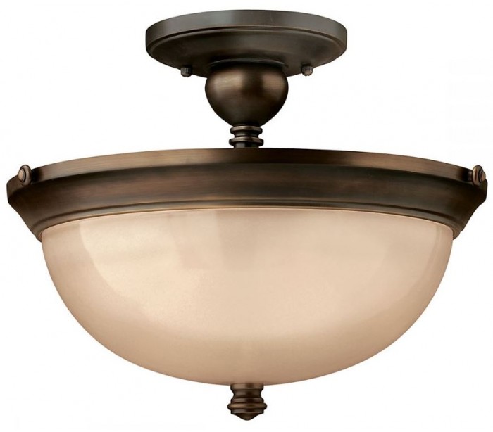 Mayflower loftlampe i et amerikansk design fra Hinkley. Lampen måler 38,1 cm i diameter og leveres til europæisk standard til 3 x E27 lyskilder. Lampen er udført i et design af aldret bronzelakeret stål og med skærm i ravfarvet glas.
