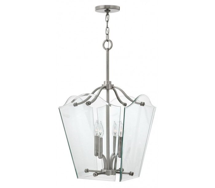 Wingate loftlampe i et amerikansk design fra Hinkley. Lampen måler 40,6 cm i bredde og dybde og leveres til europæisk standard til 4 x E14 lyskilder. Lampen er udført i et design af poleret antik nikkellakeret stål og med skærm i glas.