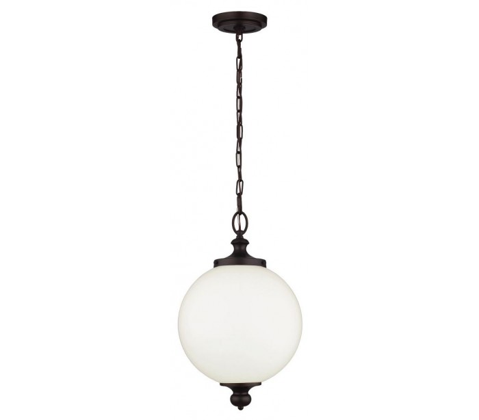 Parkman loftlampe i et amerikansk design fra Feiss. Lampen måler 30,5 cm i diameter og leveres til europæisk standard til 1 x E27 lyskilde. Lampen er udført i et design af rustik bronzelakeret stål og hvid glas.