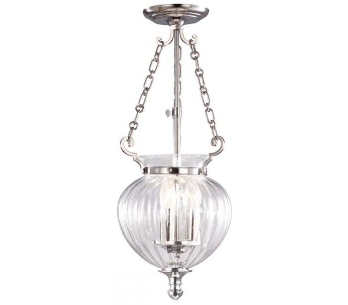 Finsbury Park loftlampe fra britiske Elstead. Lampen måler 22 cm i diameter og leveres til europæisk standard til 3 x E14 lyskilder. Lampen er udført i et design af poleret nikkellakeret stål og klart glas.