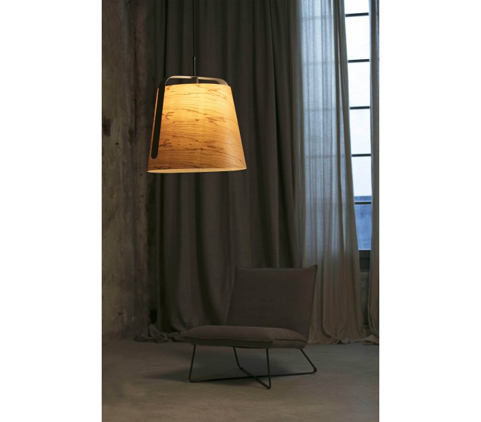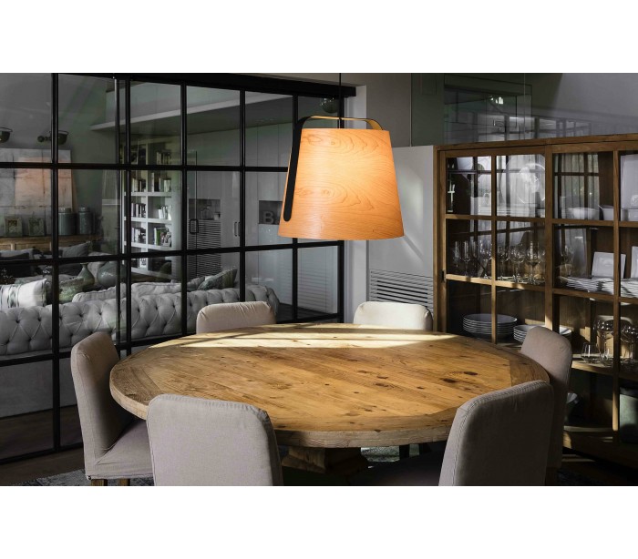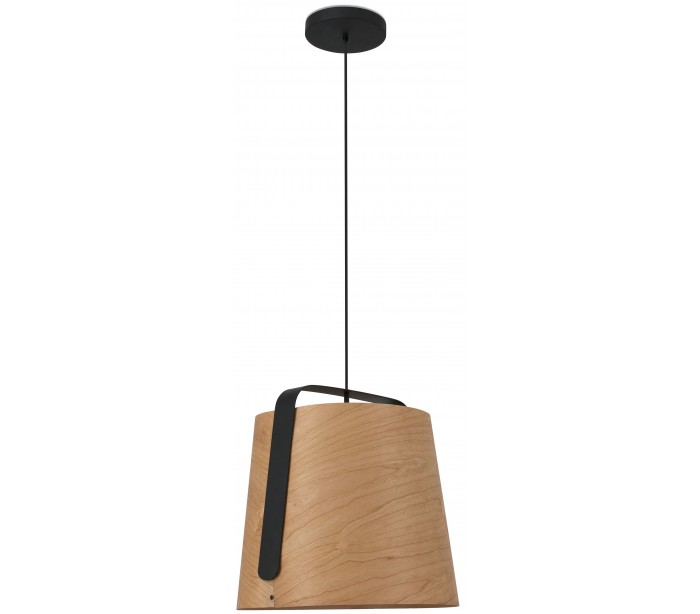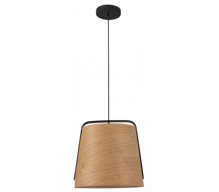 Pendellampe i et moderne design, fremstillet i sortlakeret metal og med skærm i træfinér. Lampen måler 50 cm i diameter og anvender 1 x E27 lyskilde på max. 20W (Ekskl.).
