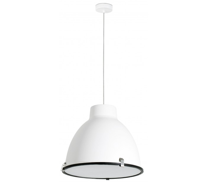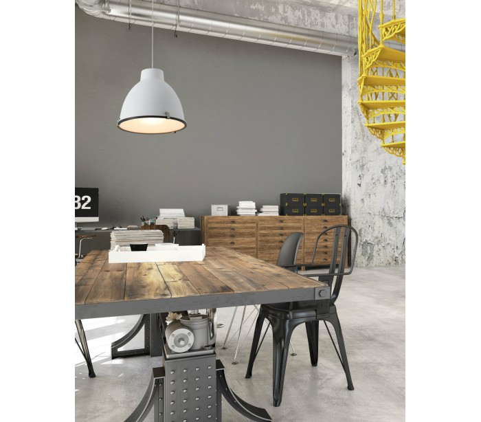 Loftlampe i et industrielt design, fremstillet i hvidlakeret metal. Lampen måler 40 cm i diameter og anvender 1 x E27 lyskilde på max. 60W (Ekskl.).