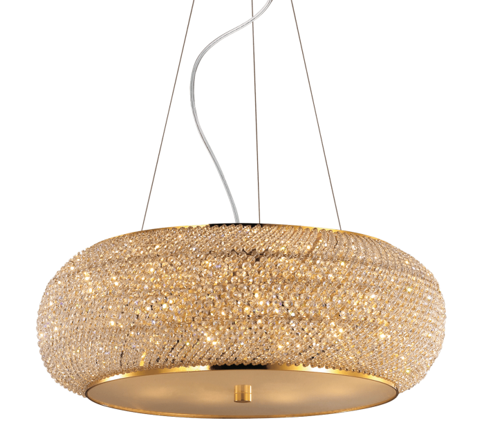 PASHA loftlampe i et moderne design fremstillet i guldfarvet metal og glaskrystaller. Lampen måler 55 cm i diameter og 148 cm i højden (max.) og anvender 10 x E14 lyskilder (ekskl.).