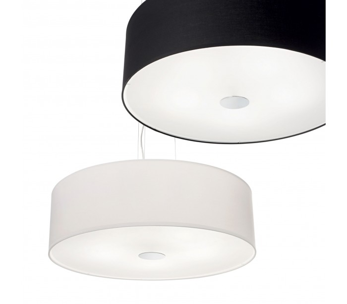 WOODY loftlampe i et moderne design fremstillet med skærm i hvid tekstil og skærmbund i mat glas. Lampen måler 50 cm i diameter og 110 cm i højden (max.) og anvender 4 x E27 lyskilder (ekskl.).