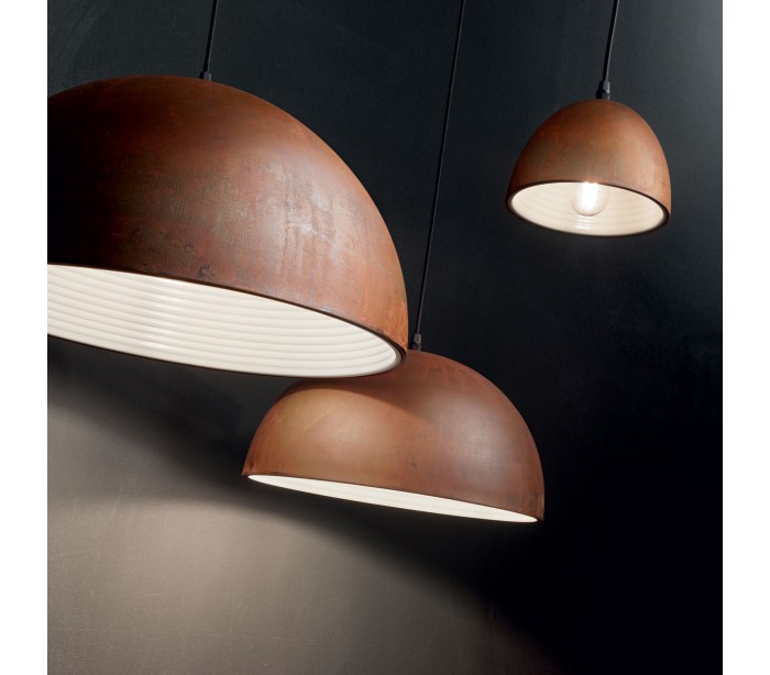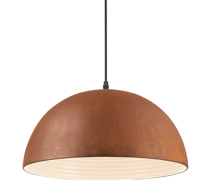 FOLK loftlampe i et råt design fremstillet i corten lakeret metal. Lampen måler 40 cm i diameter og 147 cm i højden (max.) og anvender 1 x E27 lyskilde (ekskl.).