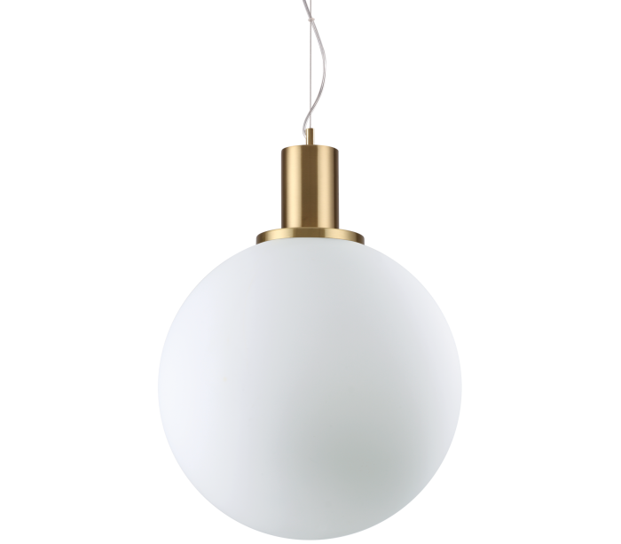 LOKO loftlampe i et moderne design fremstillet i satineret messinglakeret metal og hvid glas. Lampen måler 40 cm i diameter og 153 cm i højden (max.) og anvender 1 x E27 lyskilde (ekskl.).