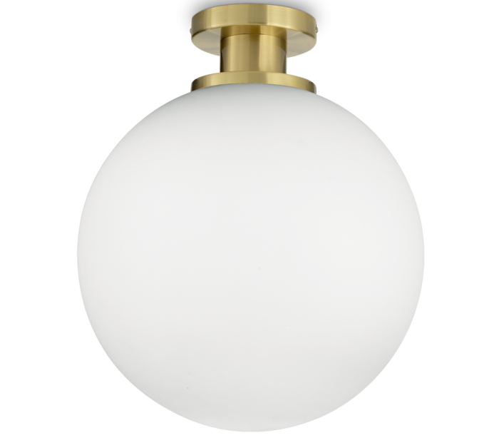 LOKO loftlampe i et moderne design fremstillet i satineret messinglakeret metal og hvid glas. Lampen måler 40 cm i diameter og 48 cm i højden og anvender 1 x E27 lyskilde (ekskl.).