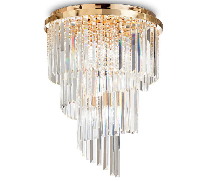CARLTON loftlampe i et moderne design fremstillet i guldfarvet metal og klart krystalglas. Lampen måler 50 cm i diameter og 69 cm i højden og anvender 12 x E14 lyskilder (ekskl.).
