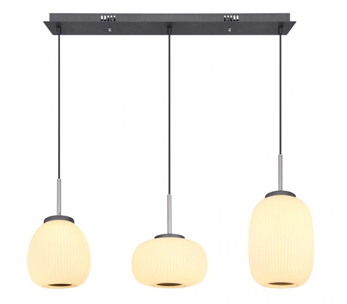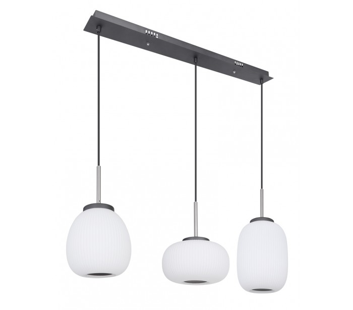 Loftlampe i et moderne design, fremstillet i opalhvid glas og antracitfarvet metal. Lampen måler 93 cm i højden og 120 cm i bredde og anvender 1 x 45W LED lyskilde (Inkl.).