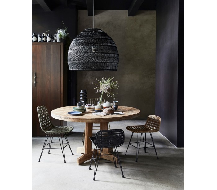 Loftlampe i et smukt design, fremstillet i sort rattanflet. Lampen måler 80 cm i diameter og 135 cm i højden og anvender 1 x E27 lyskilde (Ekskl.). Skærmens egenhøjde er 60 cm og med 75 cm ledning.