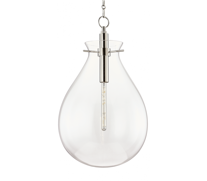 Ivy loftlampe udført i et design i poleret nikkel lakeret stål og med skærm i klart glas. Lampen måler 46 cm i diameter og 85 - 138 cm i højden og anvender 1 x E27 lyskilde.