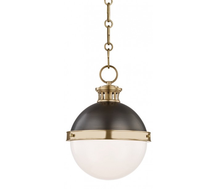 Latham loftlampe udført i et design i aldret bronzelakeret stål og med skærm i hvid opalglas. Lampen måler 24,1 cm i diameter og 41 - 170 cm i højden og anvender 1 x E27 lyskilde.