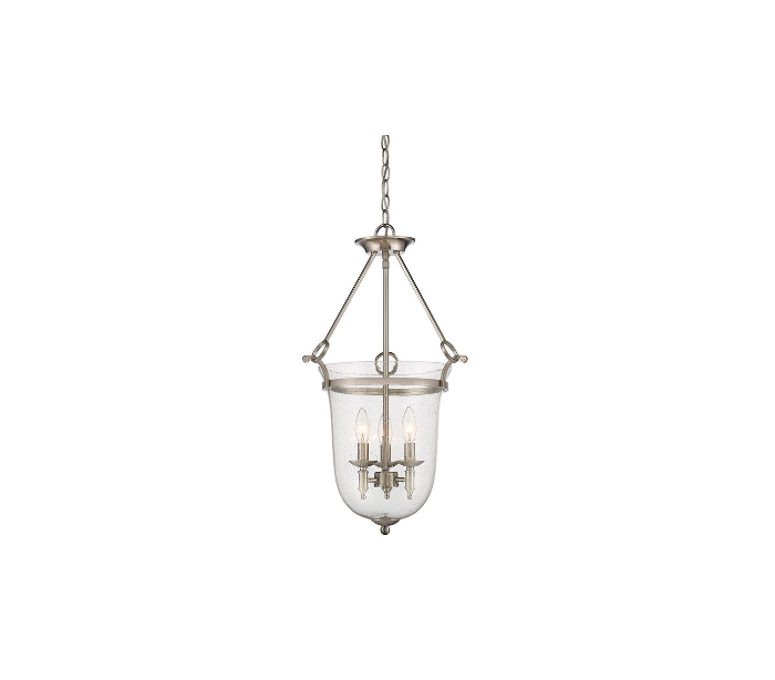 Trudy 3 loftlampe udført i et design af satineret nikkel lakeret stål og med skærm i klart glas med dråbe effekt. Lampen er fra amerikanske Savoy House og anvender 3 x E14 lyskilder og måler 41 cm i diameter og 62 - 360 cm i højden.