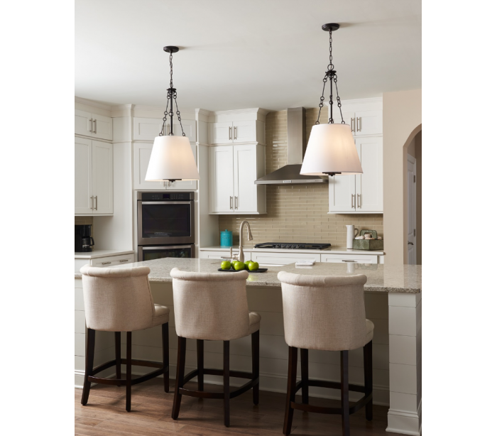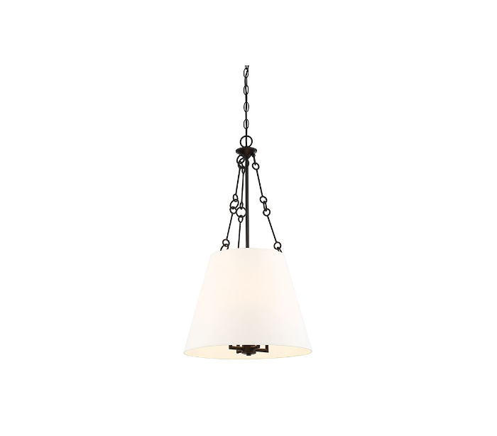 Austin 4 loftlampe udført i et design af antik bronzelakeret stål og hvid tekstil. Lampen er fra amerikanske Savoy House og anvender 4 x E14 lyskilder og måler 46 cm i diameter og 82 - 380 cm i højden.