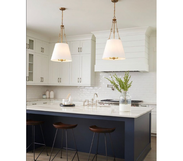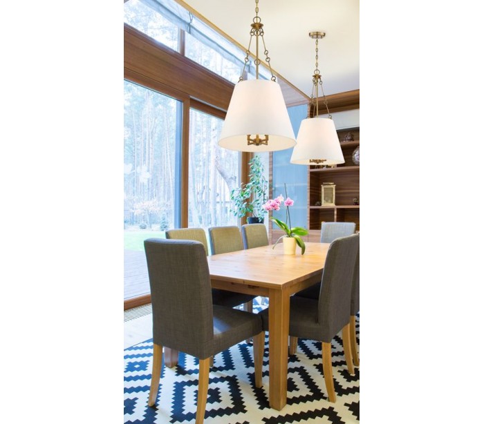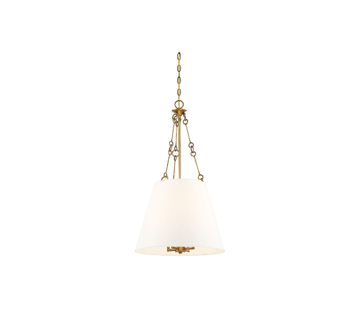 Austin 4 loftlampe udført i et design af varm messinglakeret stål og hvid tekstil. Lampen er fra amerikanske Savoy House og anvender 4 x E14 lyskilder og måler 46 cm i diameter og 82 - 380 cm i højden.