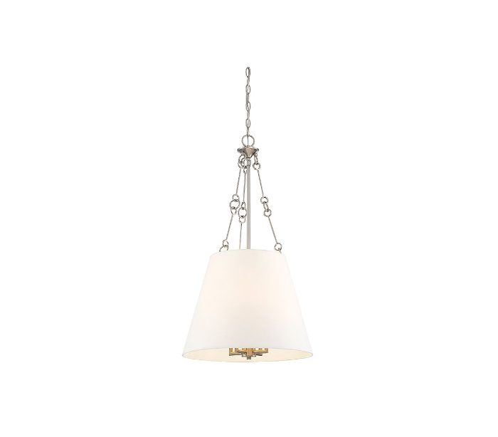 Austin 4 loftlampe udført i et design af satineret nikkel lakeret stål og hvid tekstil. Lampen er fra amerikanske Savoy House og anvender 4 x E14 lyskilder og måler 46 cm i diameter og 82 - 380 cm i højden.