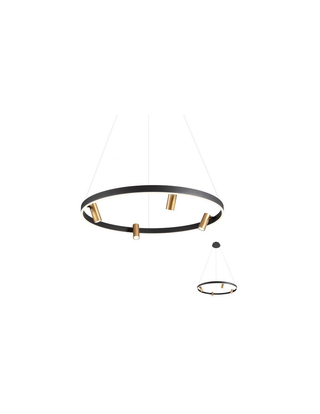 SUMMIT pendellampe udført i et design fremstillet i aluminium. Lampen måler 120 cm i højden og 80,8 cm i diameter og anvender 36 + 17,5W LED lyskilder (Inkl.). Lampen kan anvendes enten med alle lamper tændt samtidigt, kun spottene tændt eller kun med lyset i ringen tændt. Spottene er justérbare.