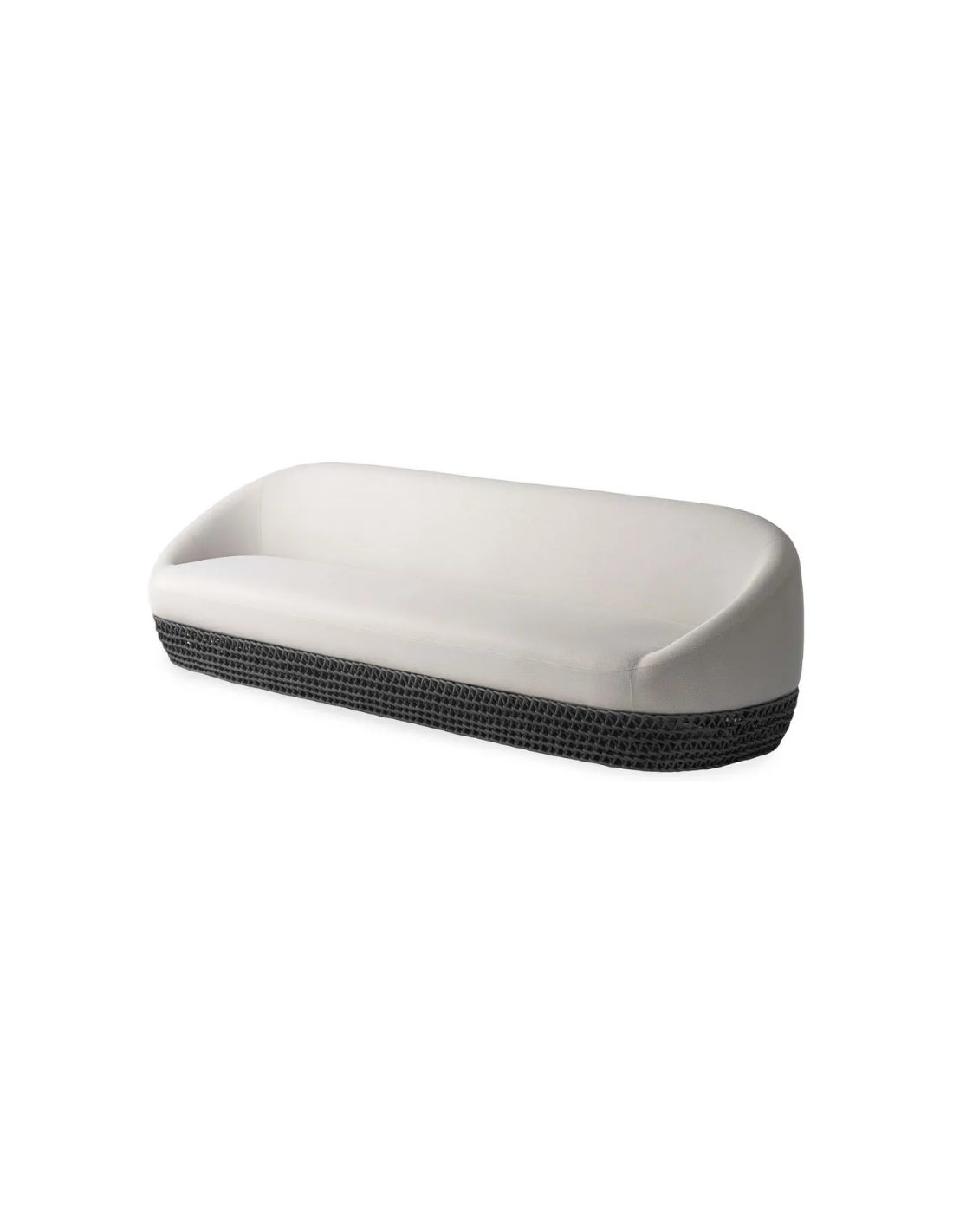 Loungesofa til haven, udført i et design af antracitfarvet syntetisk rattan med stel af aluminium og med tyk komfortabel hynde i duegråt vandafvisende olefin (vandafvisende, ikke vandtæt). Sofaen tåler at stå ude hele sommeren og er resistent overfor regn og fugt.
