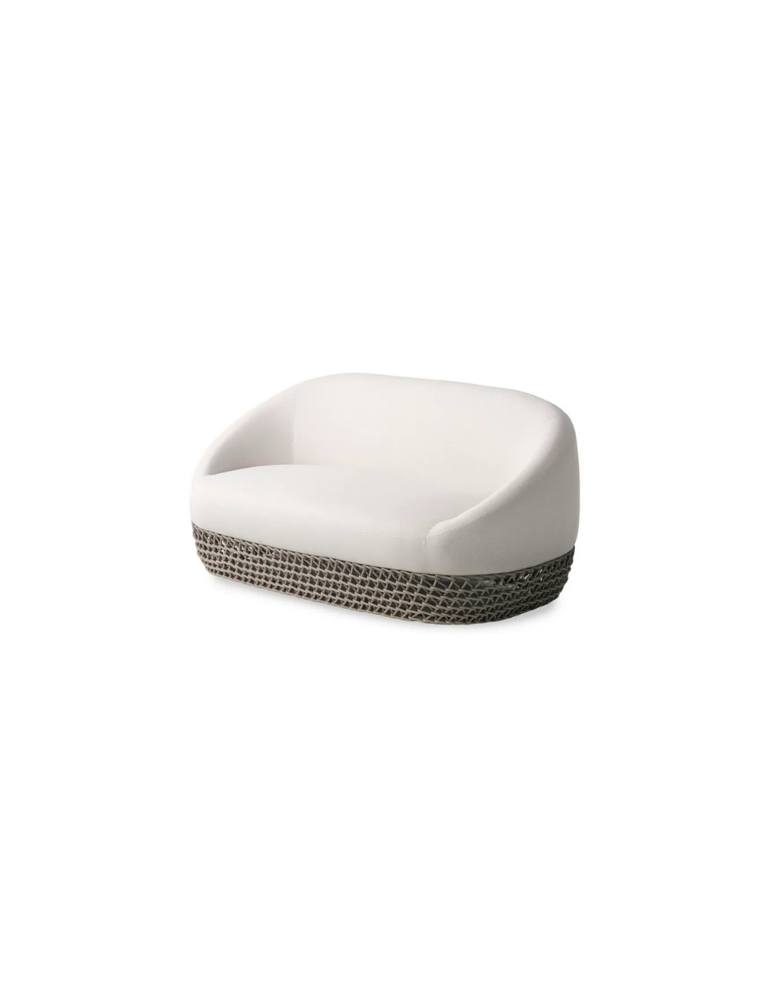 Loungesofa til haven, udført i et design af beige syntetisk rattan med stel af aluminium og med tyk komfortabel hynde i taupefarvet vandafvisende olefin (vandafvisende, ikke vandtæt). Sofaen tåler at stå ude hele sommeren og er resistent overfor regn og fugt.