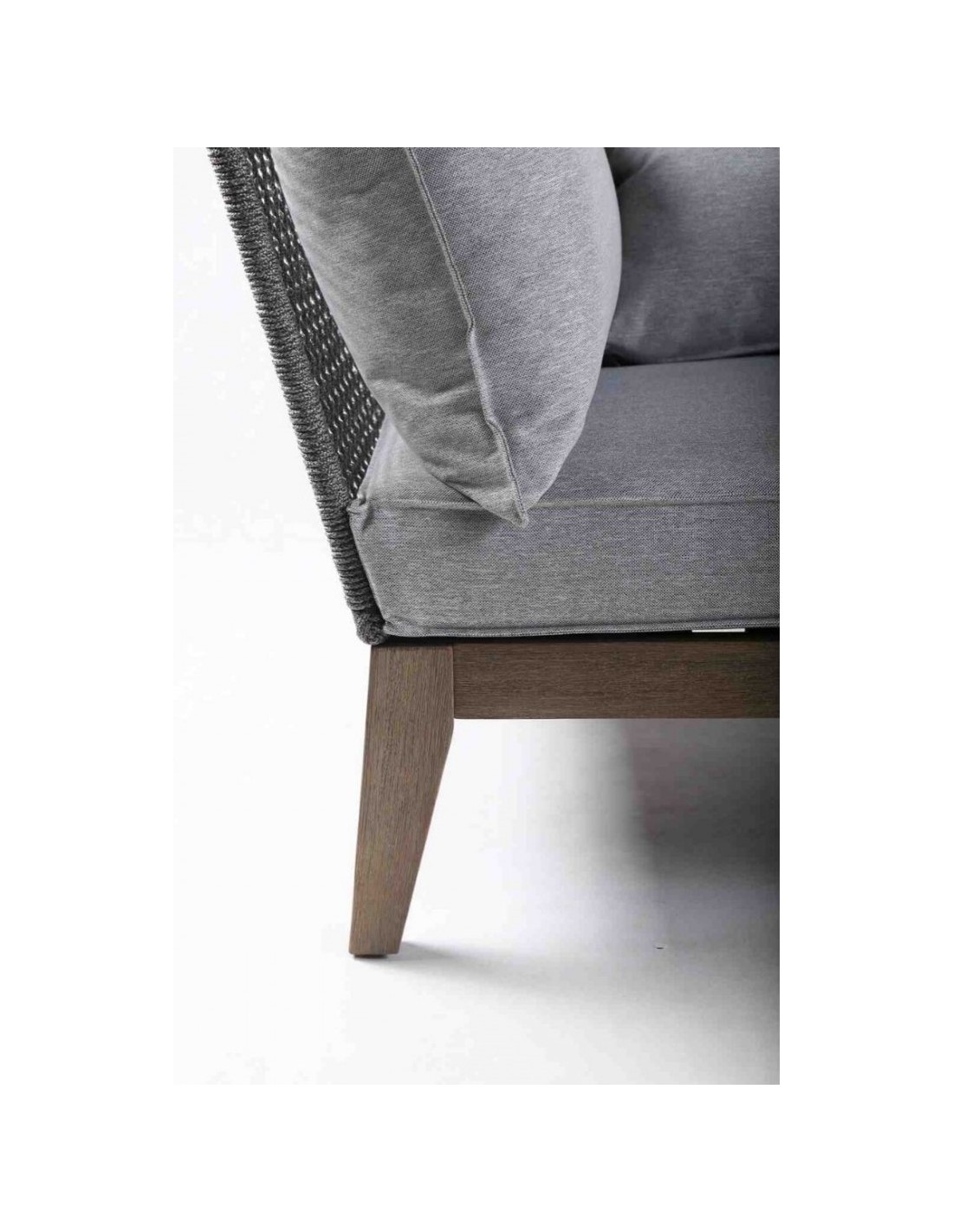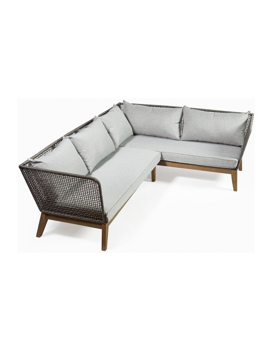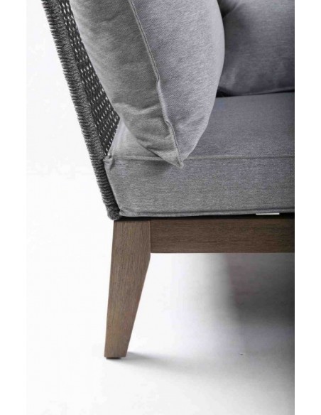 Loungesofa udført i et design i eucalyptustræ og gråt reb med skelet i aluminium. Sofaen måler 71 cm i højden over ryggen og 239 x 175 cm i bredde og dybde. Sofaen tåler at stå ude i regn og fugt, dog anbefaler vi at opbevare sofaen indendørs ved frost.
