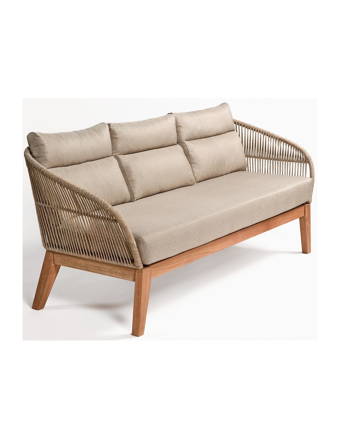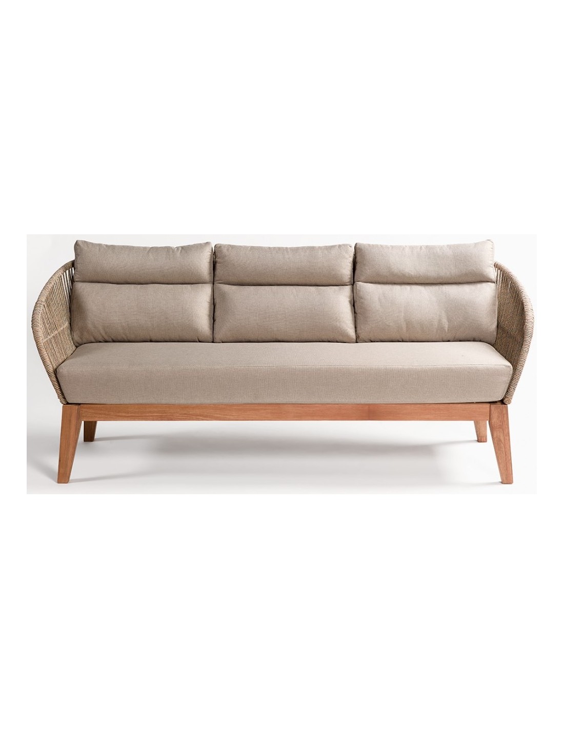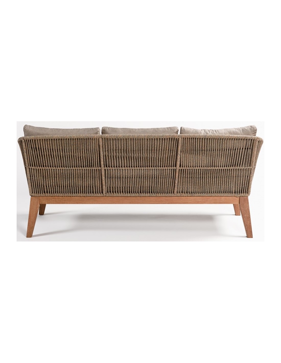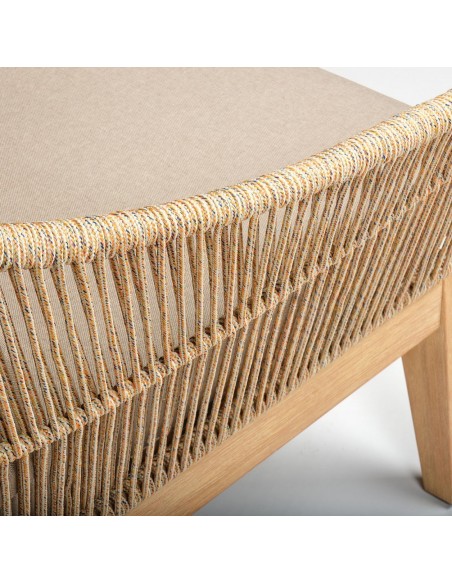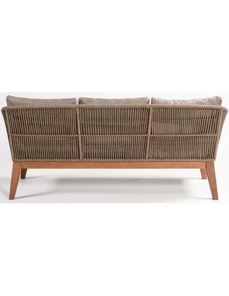 Loungesofa til haven i et design i eucalyptustræ og med sæde i beige reb. Sofaen måler 72 cm i højden over ryggen og med siddehøjde på 40 cm. Sofaen tåler at stå ude i regn og fugt, dog anbefaler vi at opbevare den indendørs ved frost.