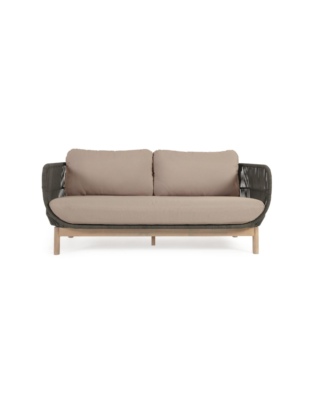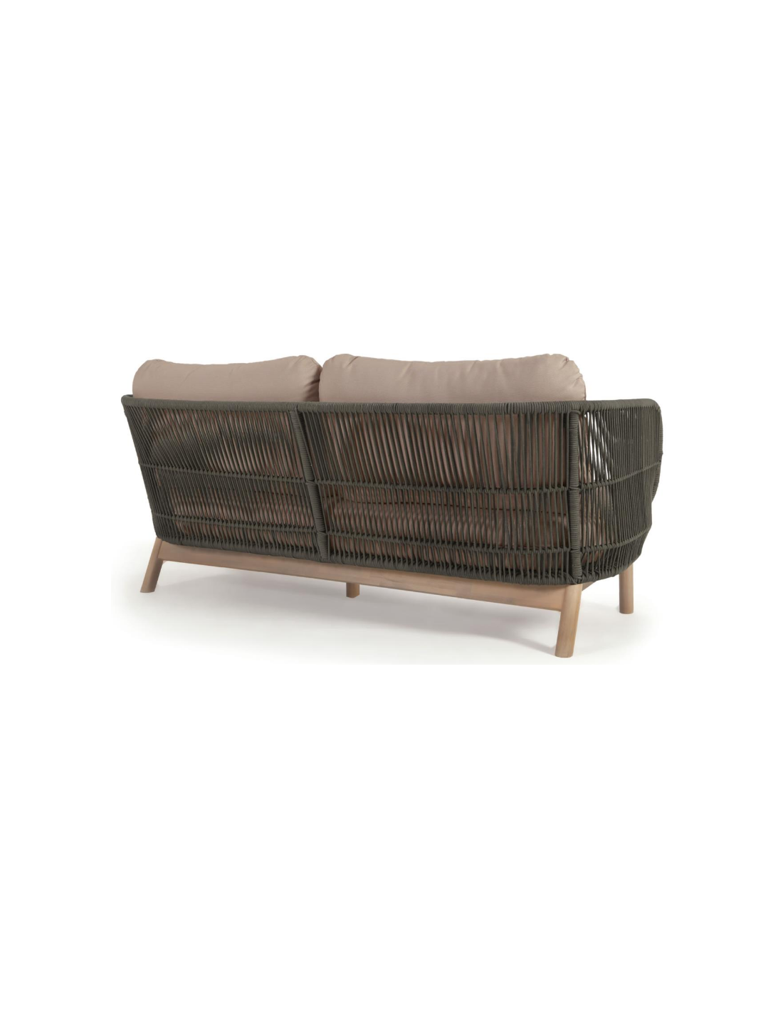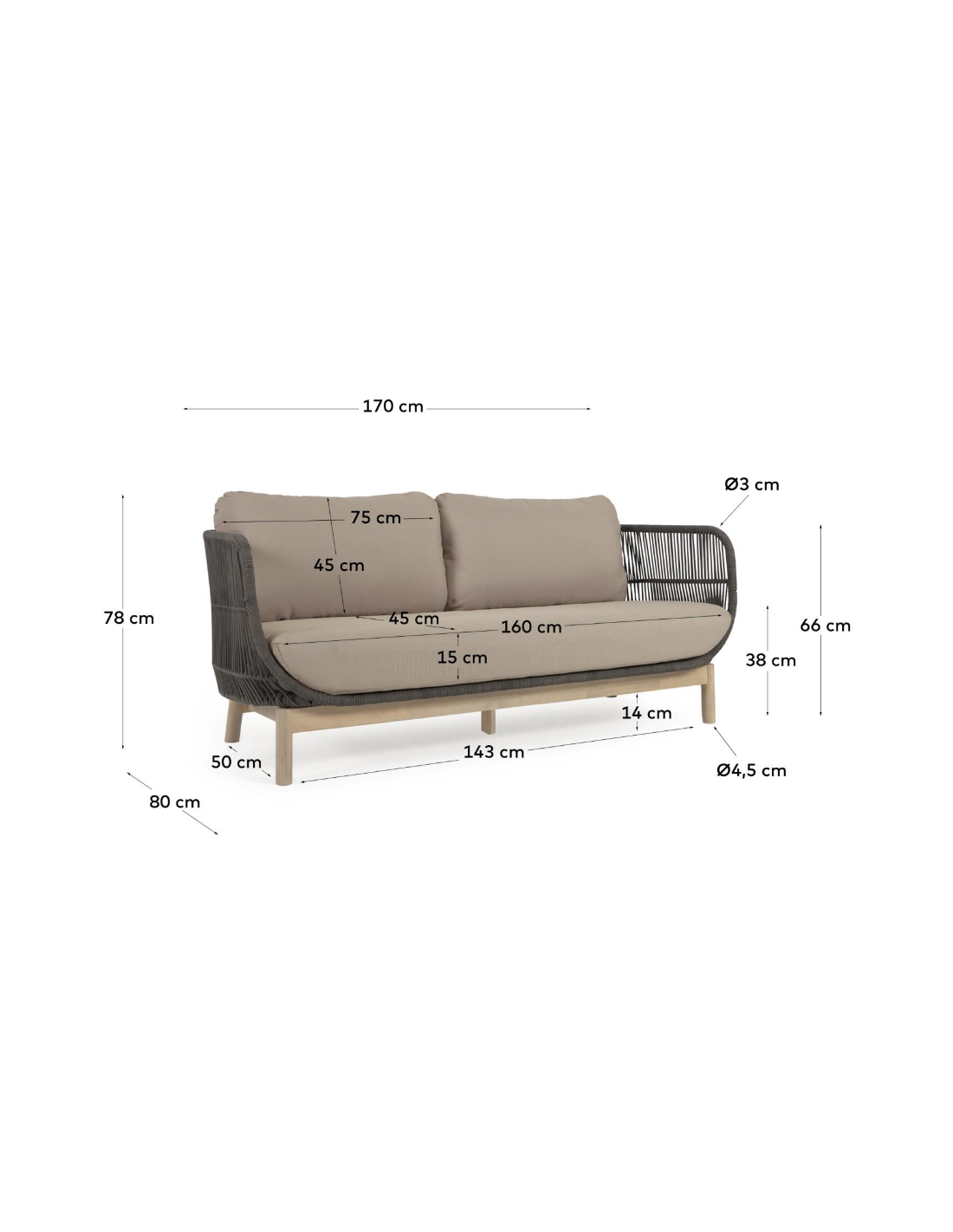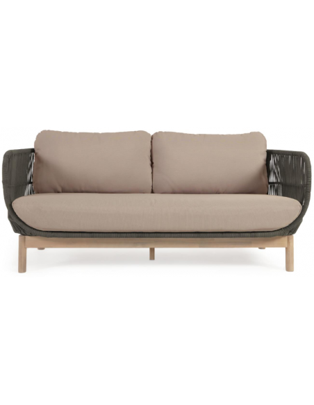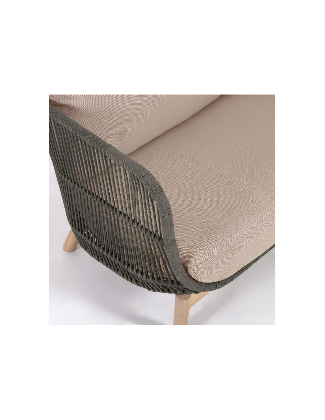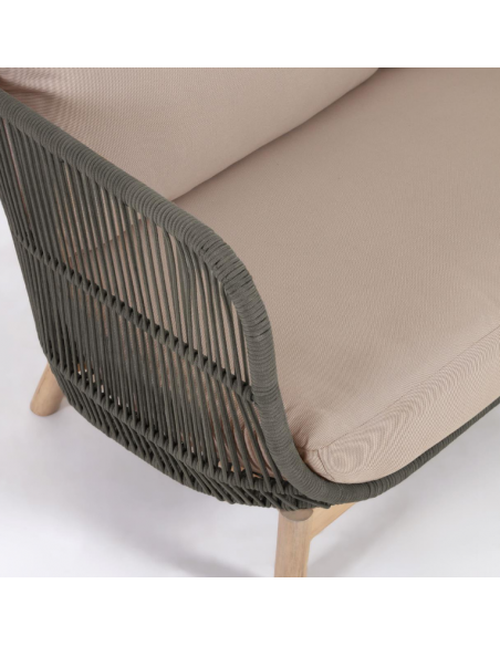 Loungesofa til haven i et design fra LaForma. Sofaen er fremstillet i akacietræ med reb i grågrøn, og hynder i beige tekstil. Sofaen måler 78 cm i højden over ryggen og 170 x 80 cm i bredde og dybde. Både siddehynde og rygpuder medfølger.