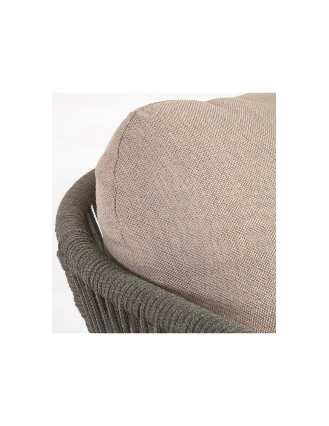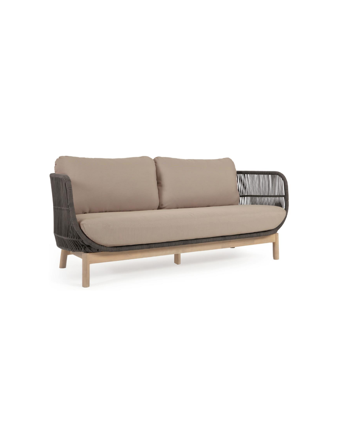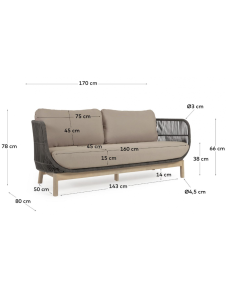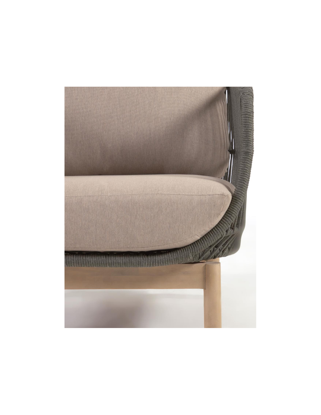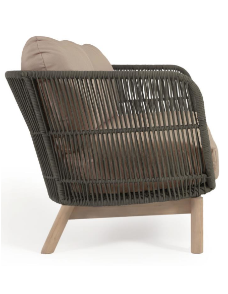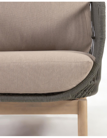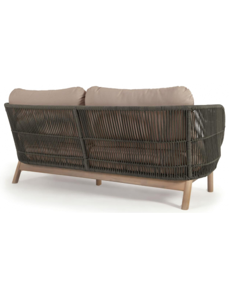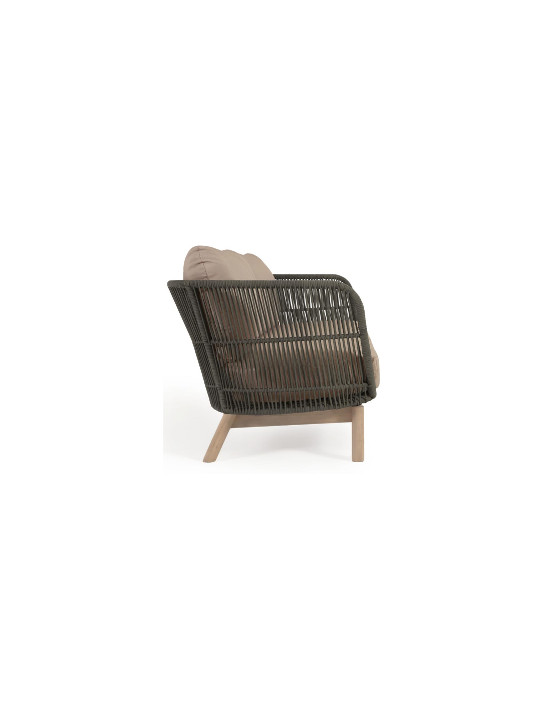 Loungesofa til haven i et design fra LaForma. Sofaen er fremstillet i akacietræ med reb i grågrøn, og hynder i beige tekstil. Sofaen måler 78 cm i højden over ryggen og 170 x 80 cm i bredde og dybde. Både siddehynde og rygpuder medfølger.