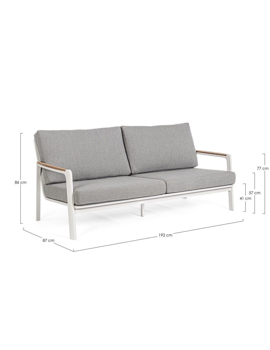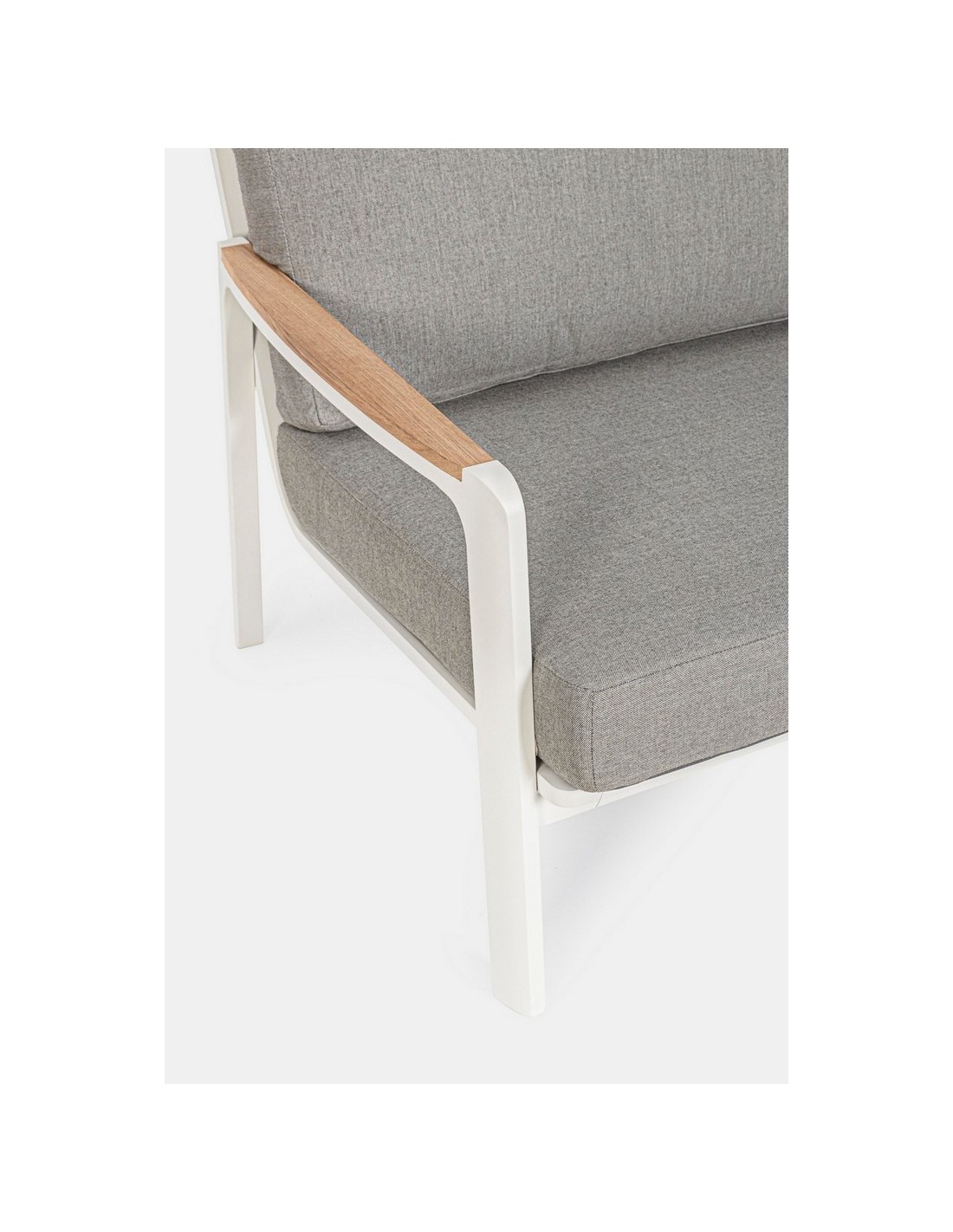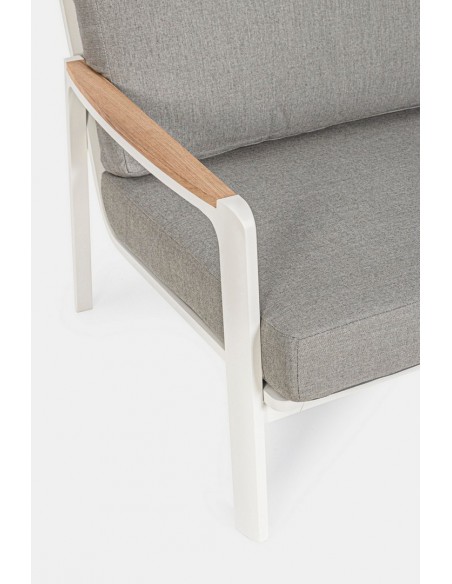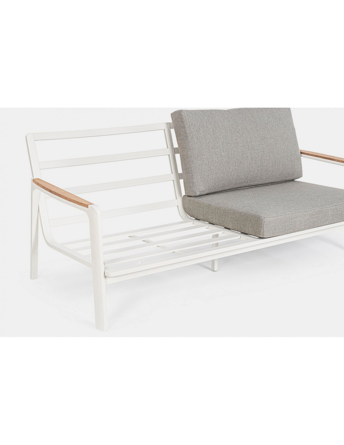 Loungesofa i et design af hvvid pulverlakeret aluminium med armlæn i teaktræ og hynder i lysegrå akryl. Sofaen måler 192 cm i bredden.
