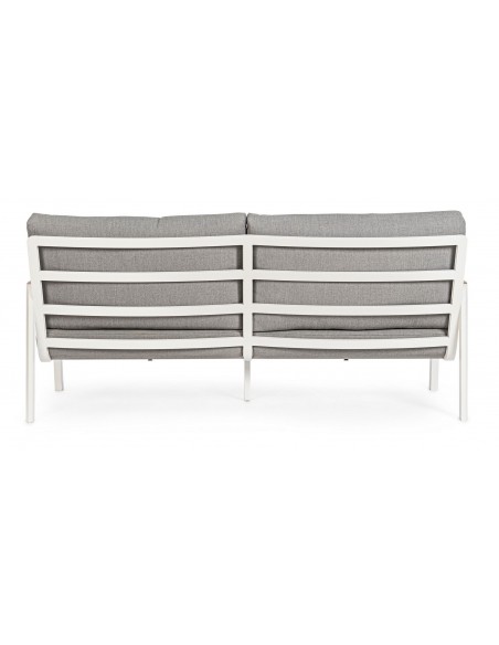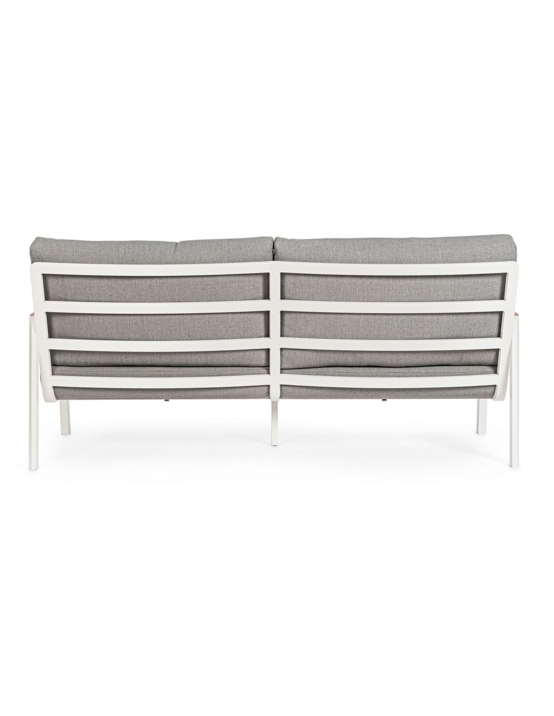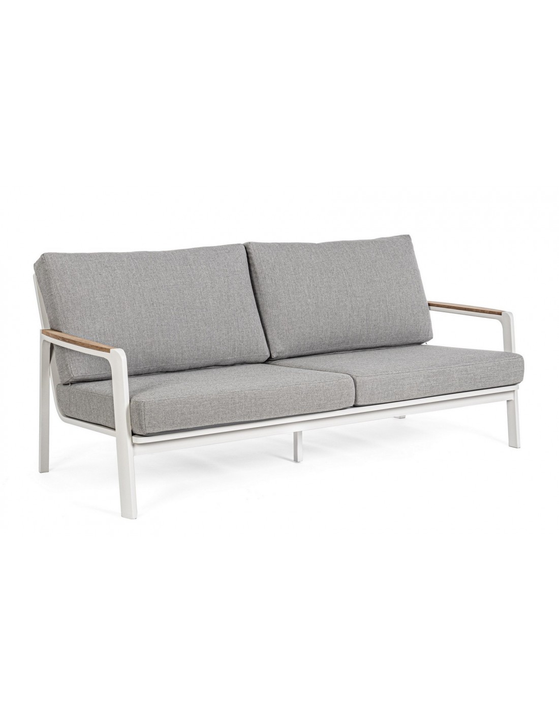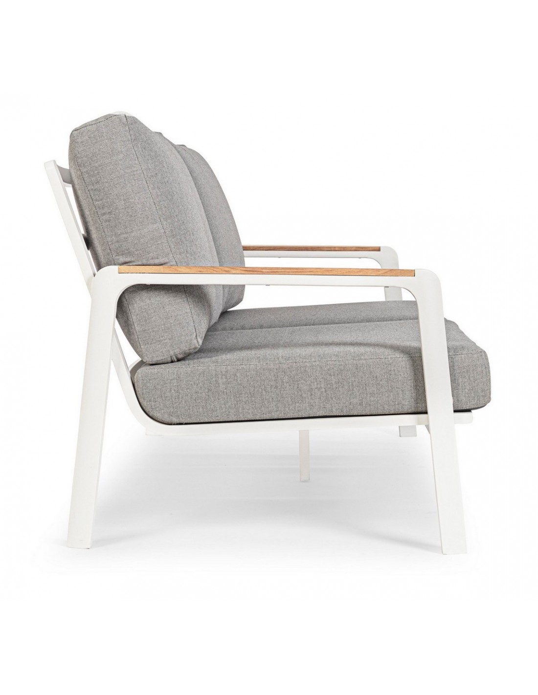 Loungesofa i et design af hvvid pulverlakeret aluminium med armlæn i teaktræ og hynder i lysegrå akryl. Sofaen måler 192 cm i bredden.