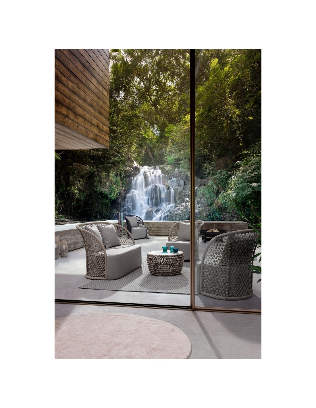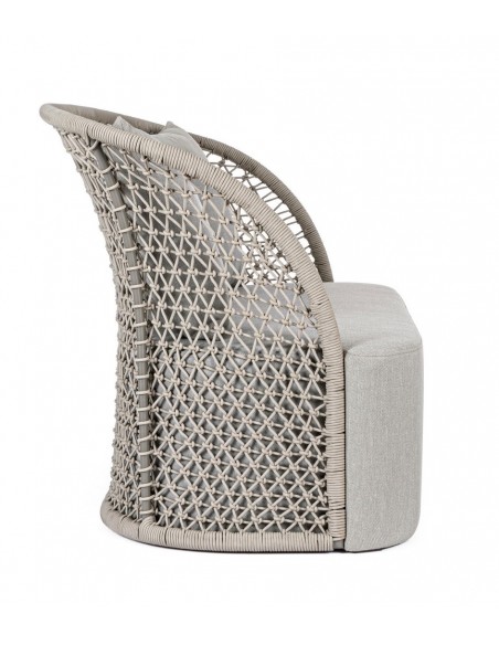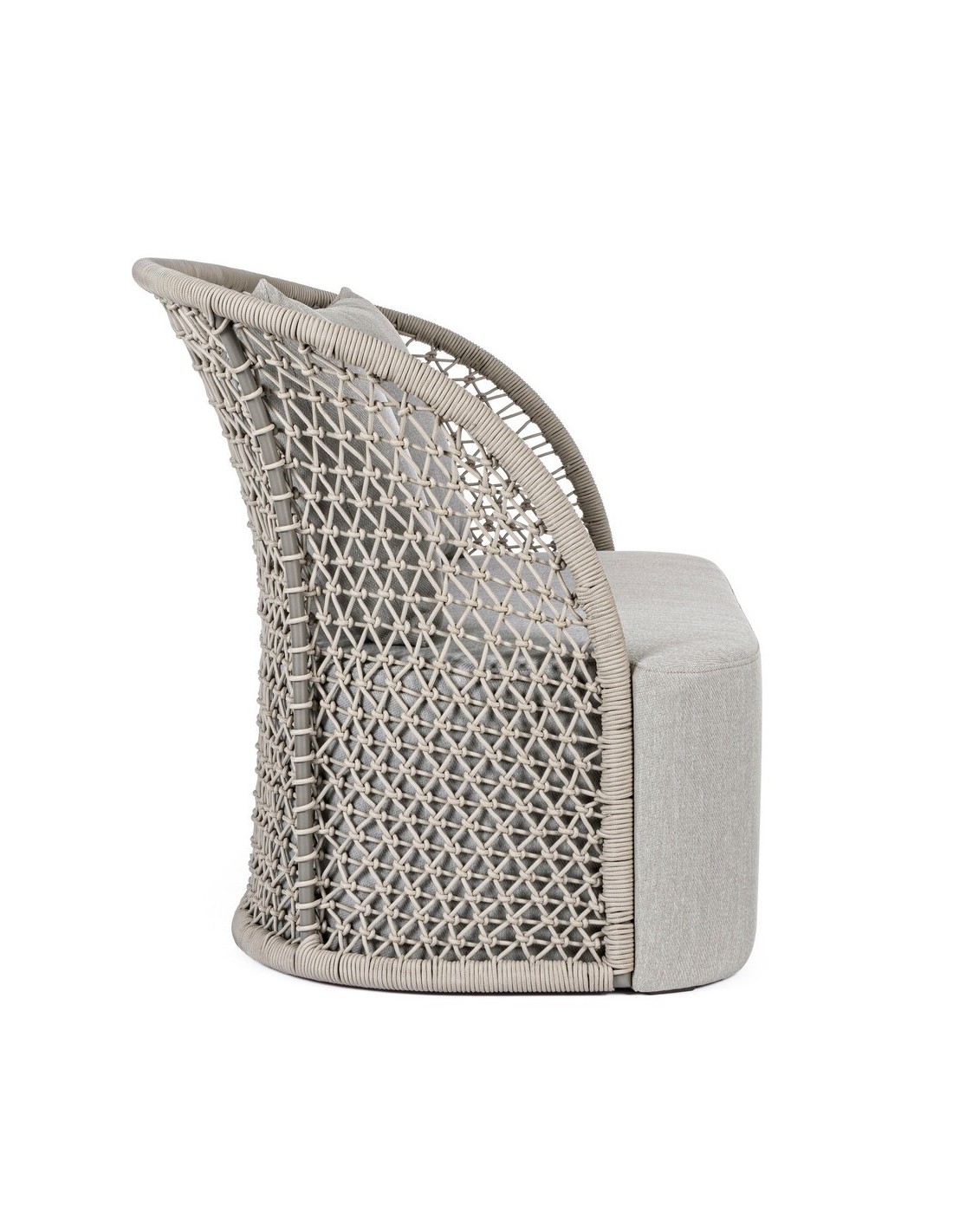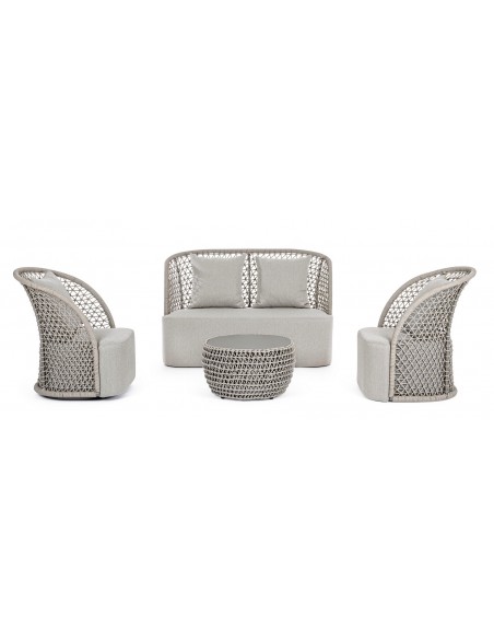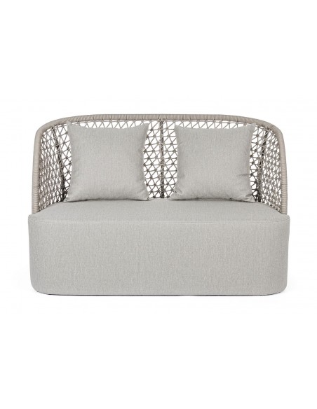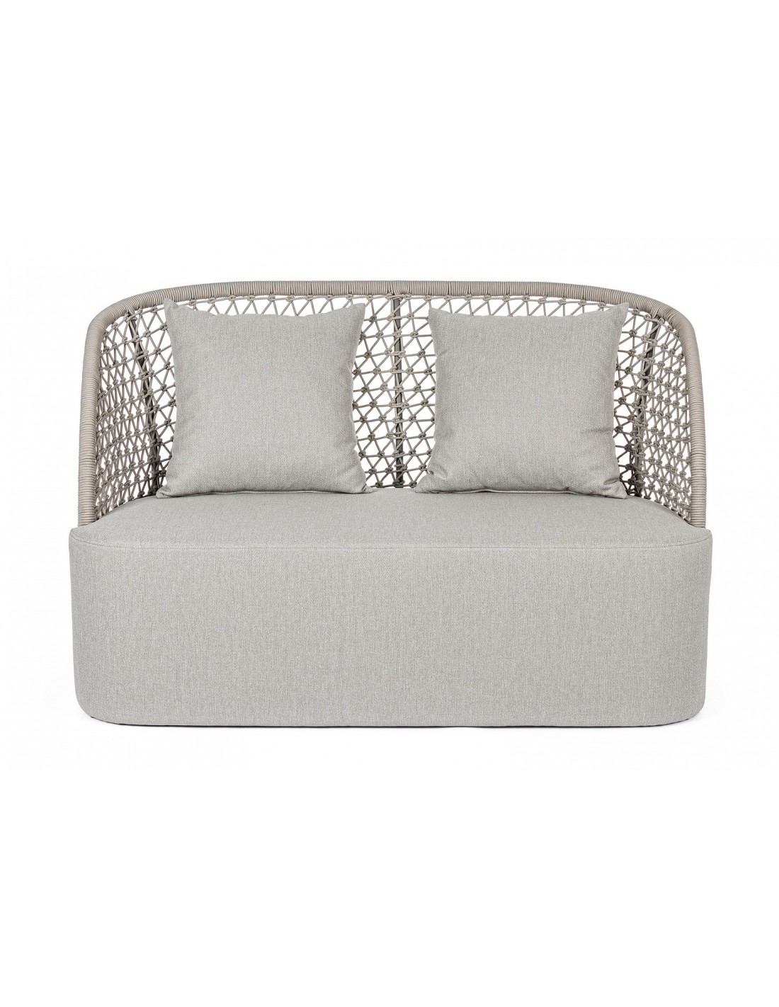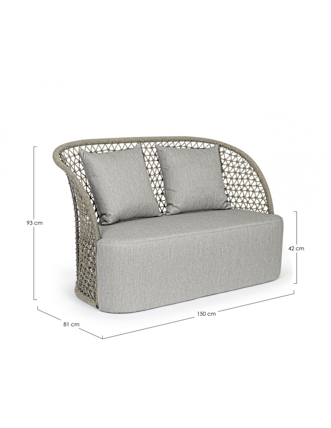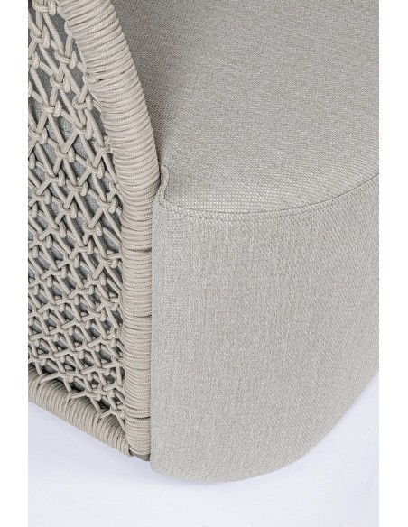 Loungesofa udført i et design af aluminium betrukket med UV resistent og vandafvisende reb. Dertil sæde og puder i grå UV resistent og vandafvisende olefin. Sofaen måler 150 cm i bredden. Møblet tåler regnvejr, men puden anbefaler vi dog at opbevare indendørs, når møblet ikke er i brug.