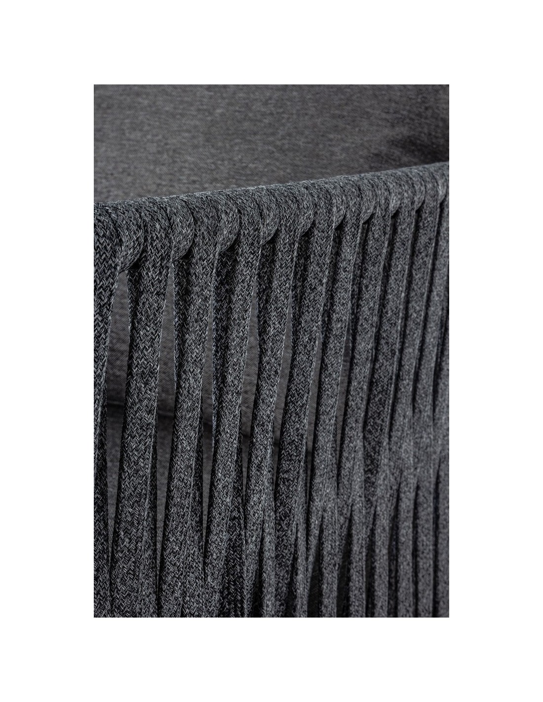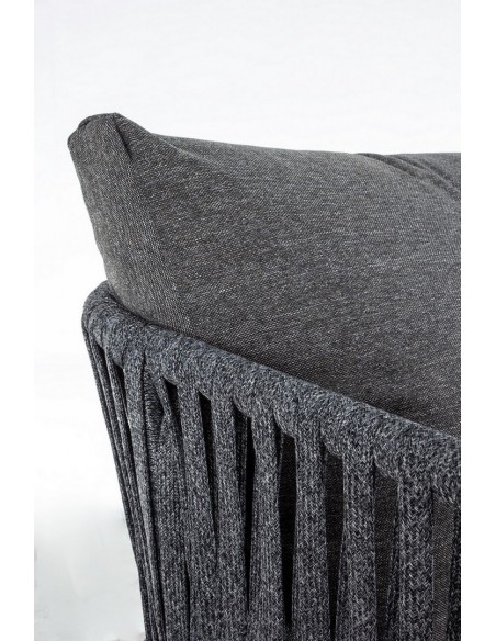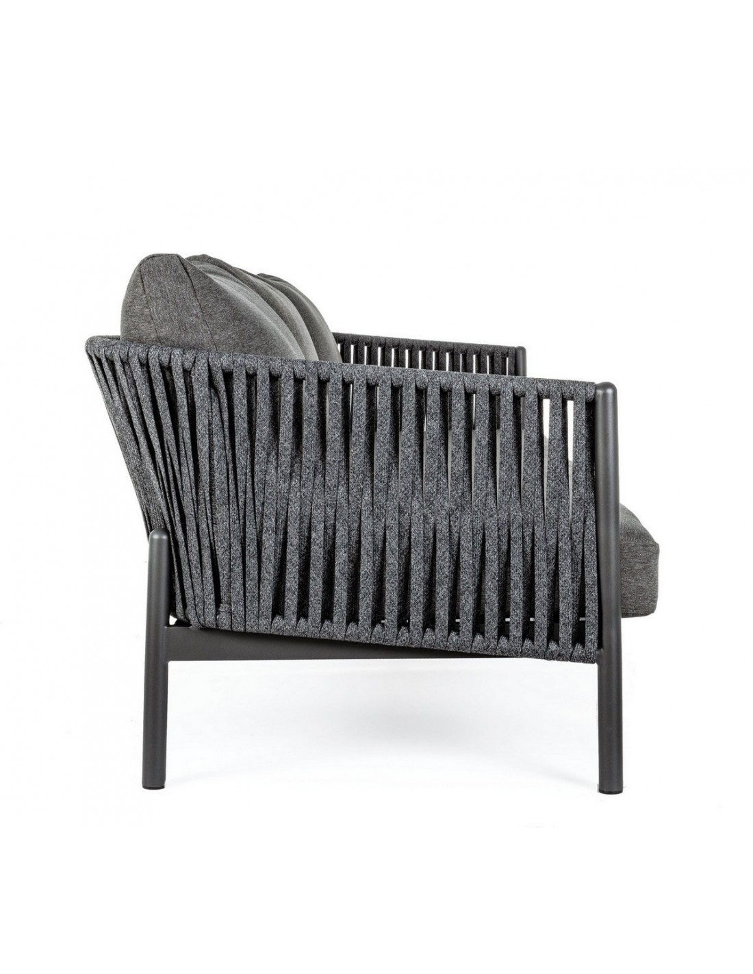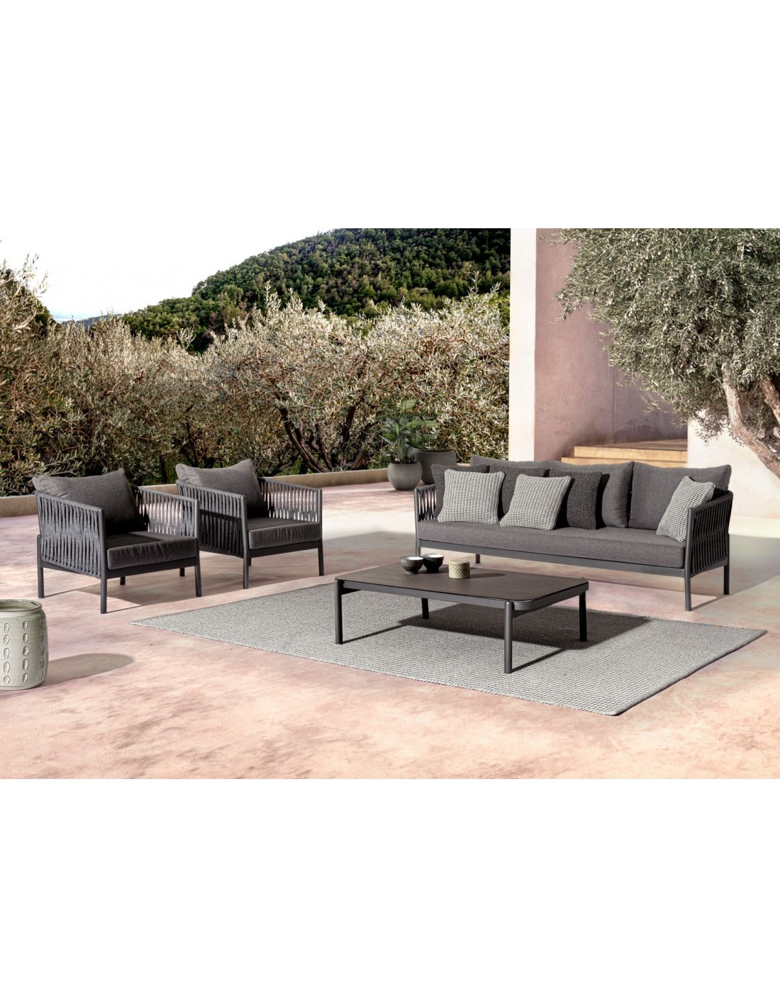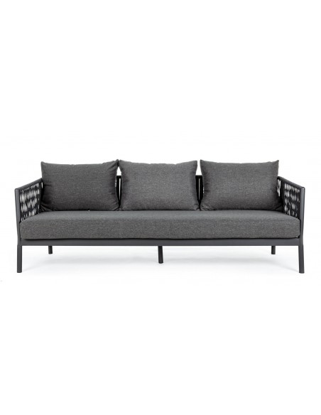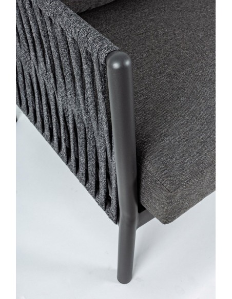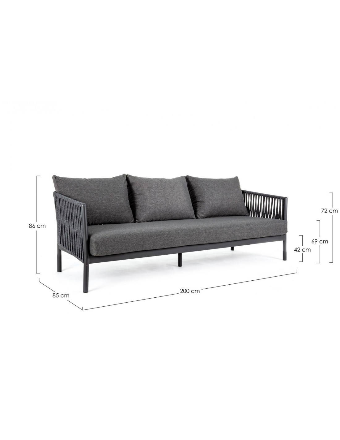 Loungesofa udført i et design af charcoal lakeret aluminium og tetoron polyester med skumfyld. Dertil hynder i grå olefin med aftagelige betræk. Sofaen måler 200 cm i bredden. Møblet tåler regnvejr, men hynder og puder anbefaler vi dog at opbevare indendørs, når møblet ikke er i brug.