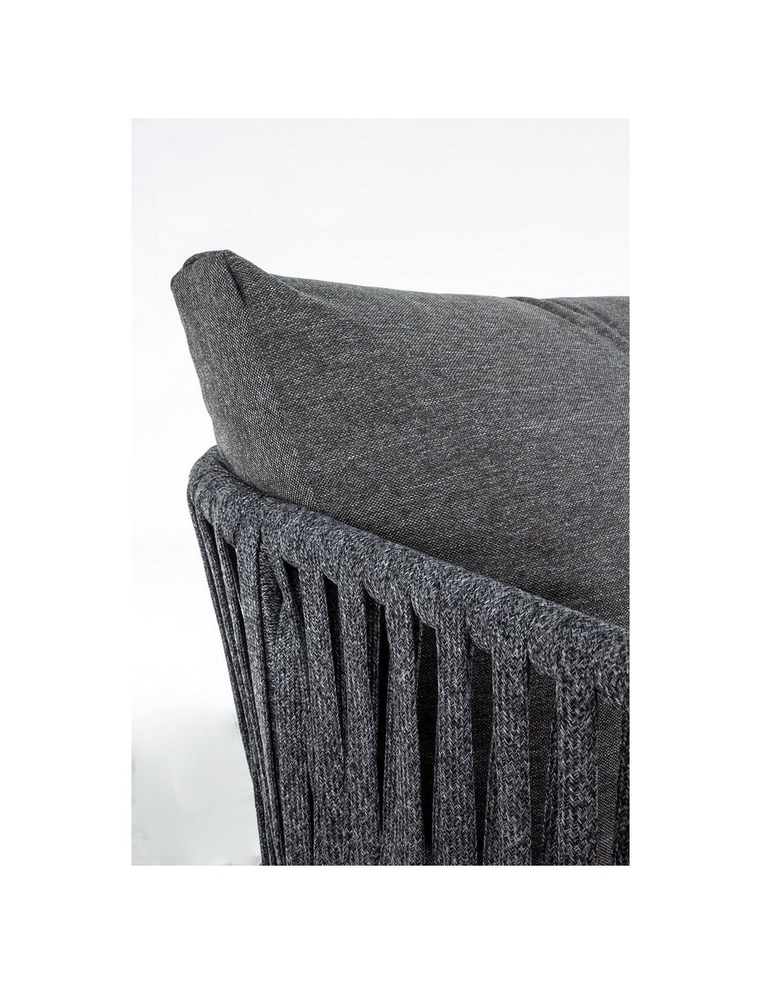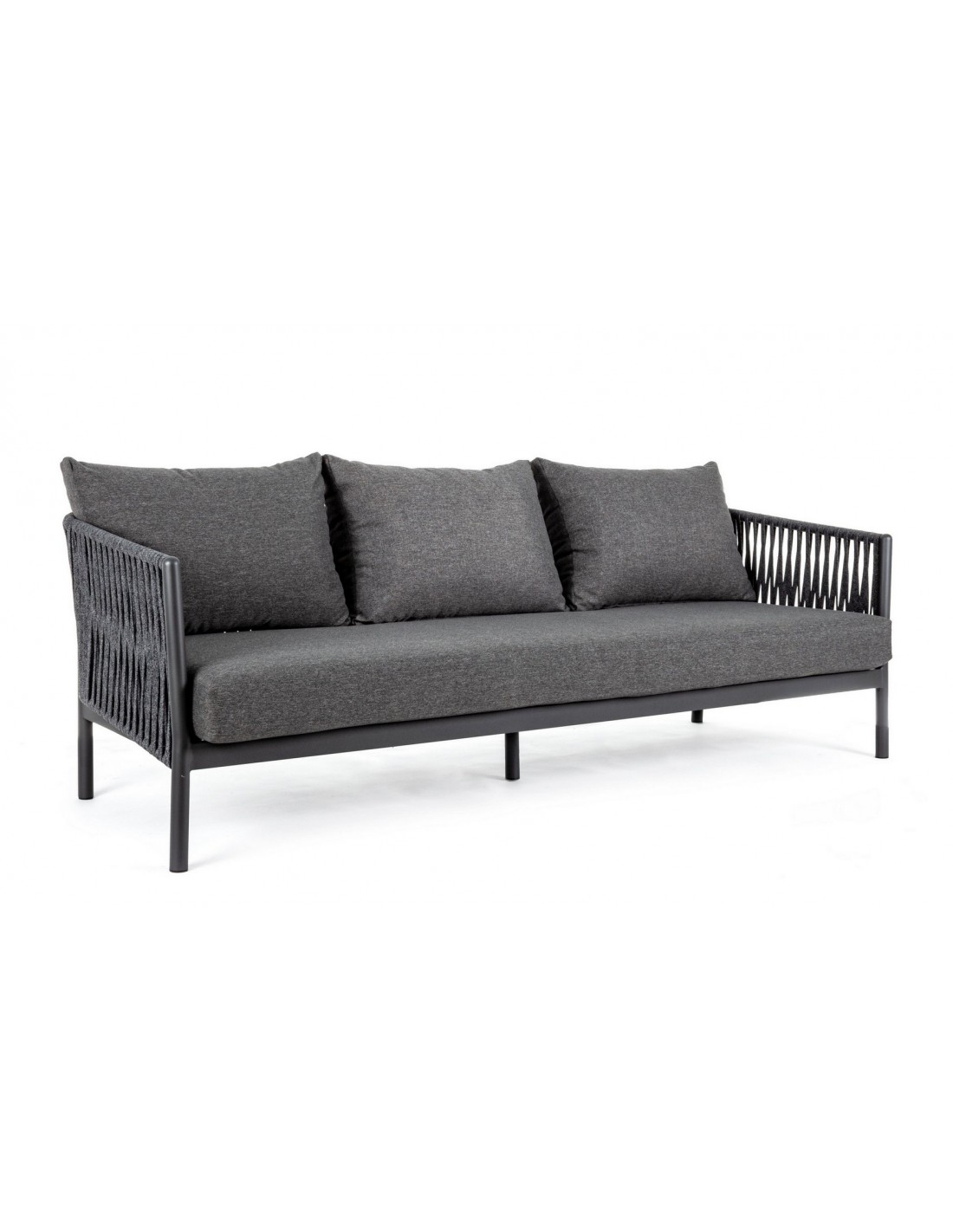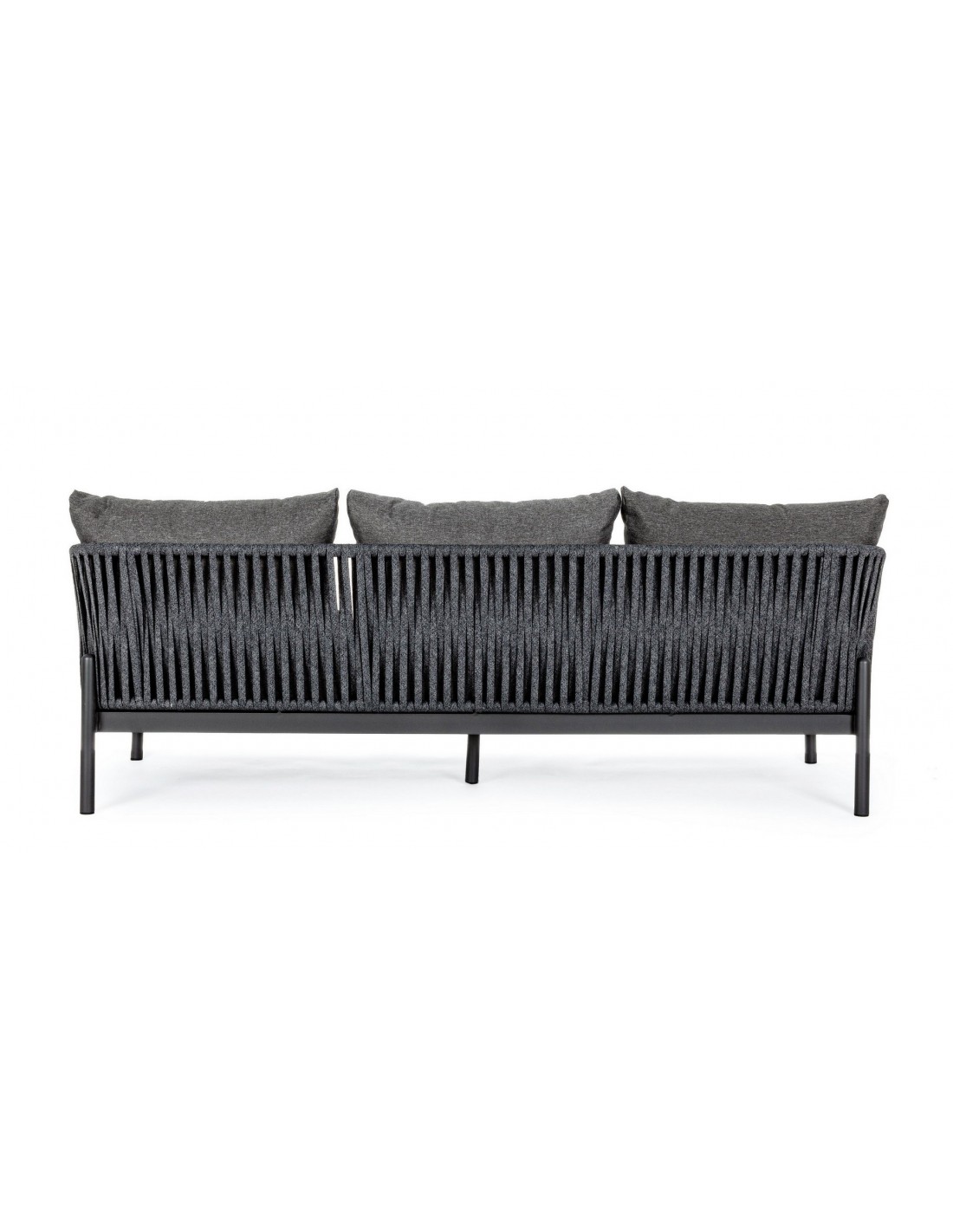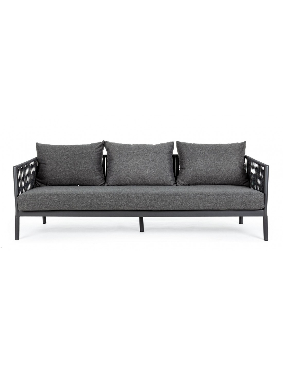 Loungesofa udført i et design af charcoal lakeret aluminium og tetoron polyester med skumfyld. Dertil hynder i grå olefin med aftagelige betræk. Sofaen måler 200 cm i bredden. Møblet tåler regnvejr, men hynder og puder anbefaler vi dog at opbevare indendørs, når møblet ikke er i brug.