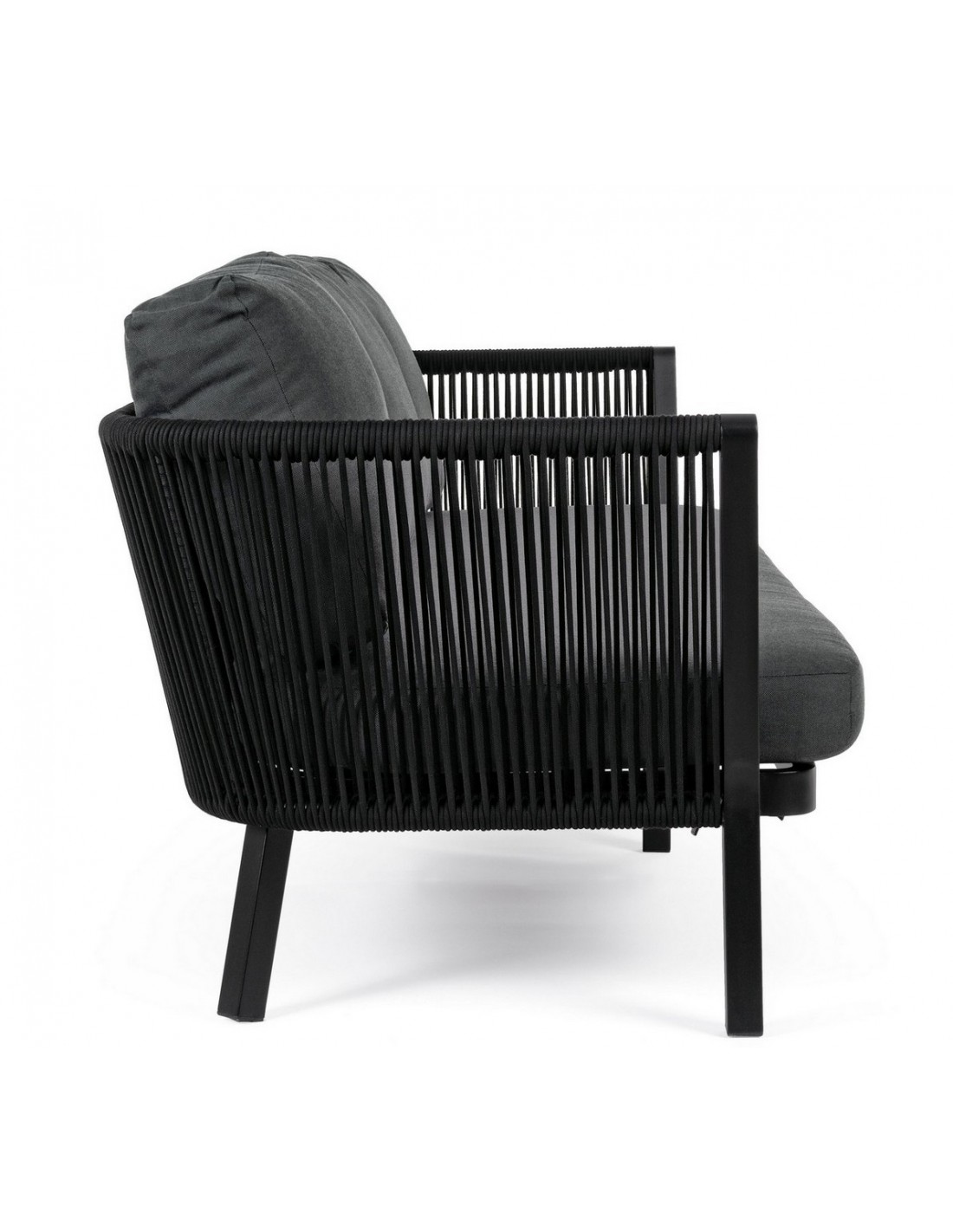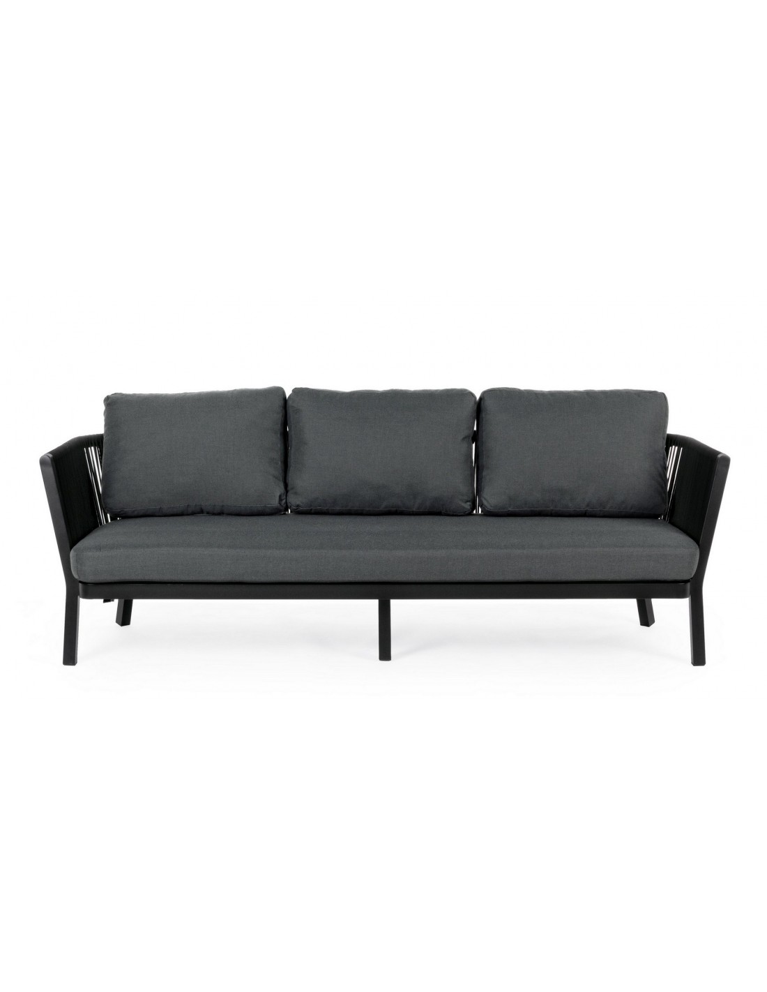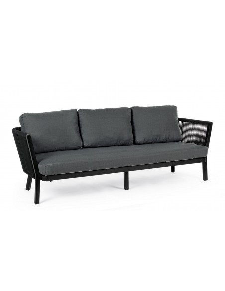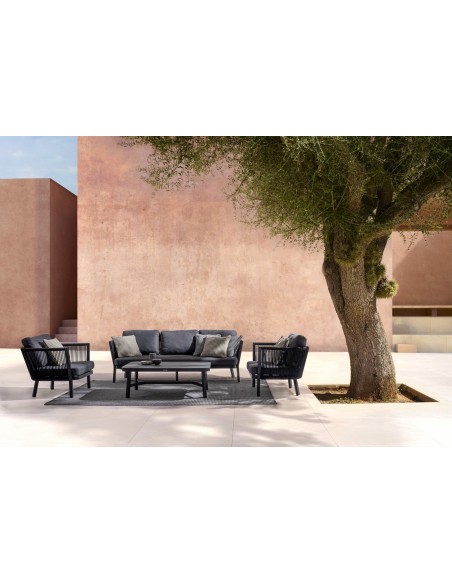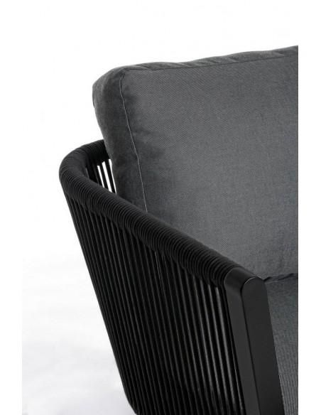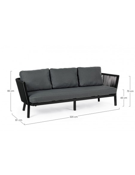 Loungesofa udført i et design af sortlakeret aluminium og teflonbehandlet akryl (Vandafvisende og UV resistent). Dertil hynder i charcoal polyester med aftagelige betræk. Sofaen måler 225 cm i bredden. Møblet tåler regnvejr, men hynder og puder anbefaler vi dog at opbevare indendørs, når møblet ikke er i brug.