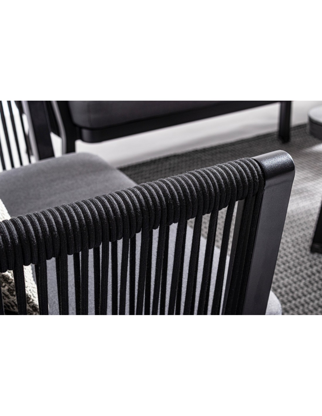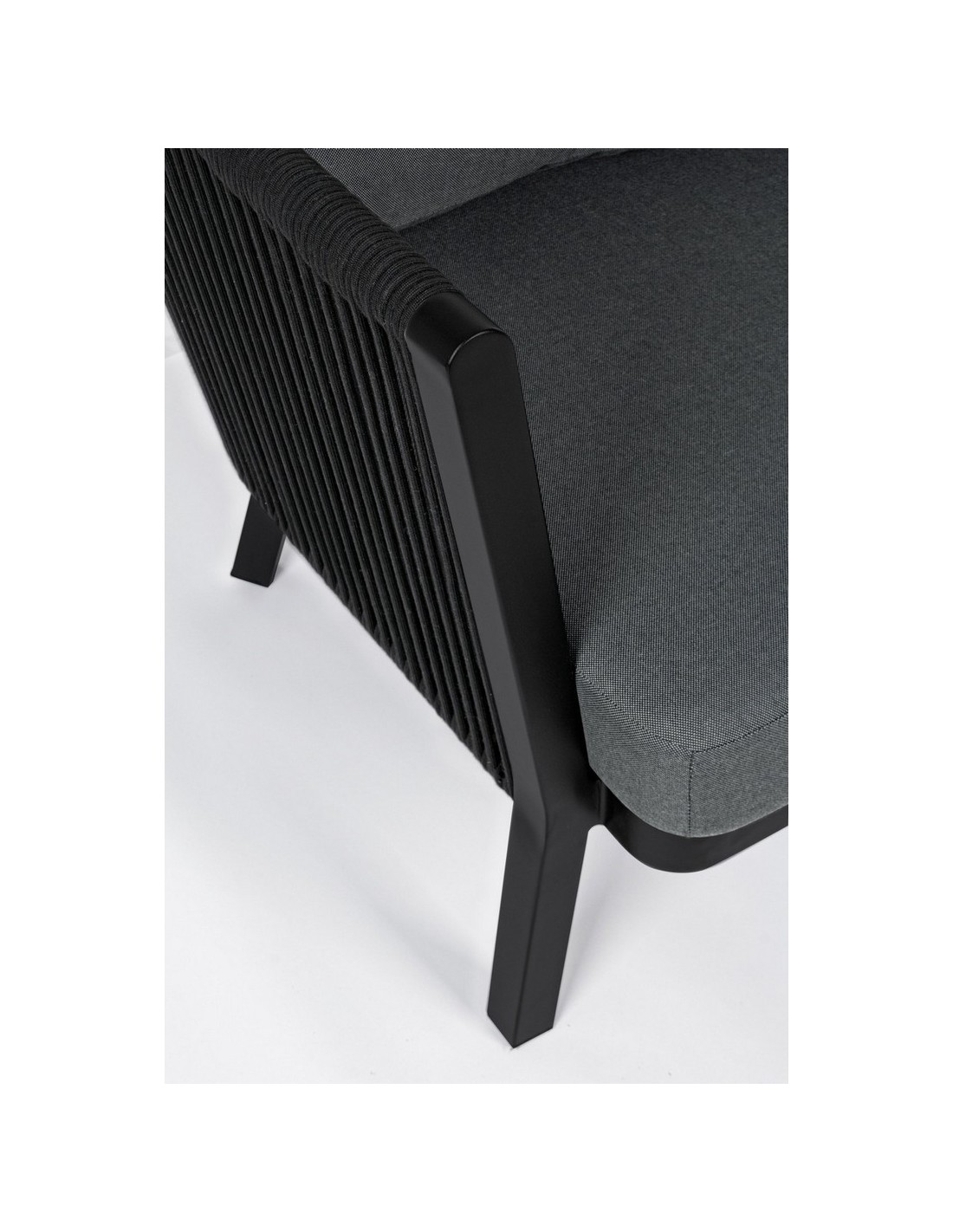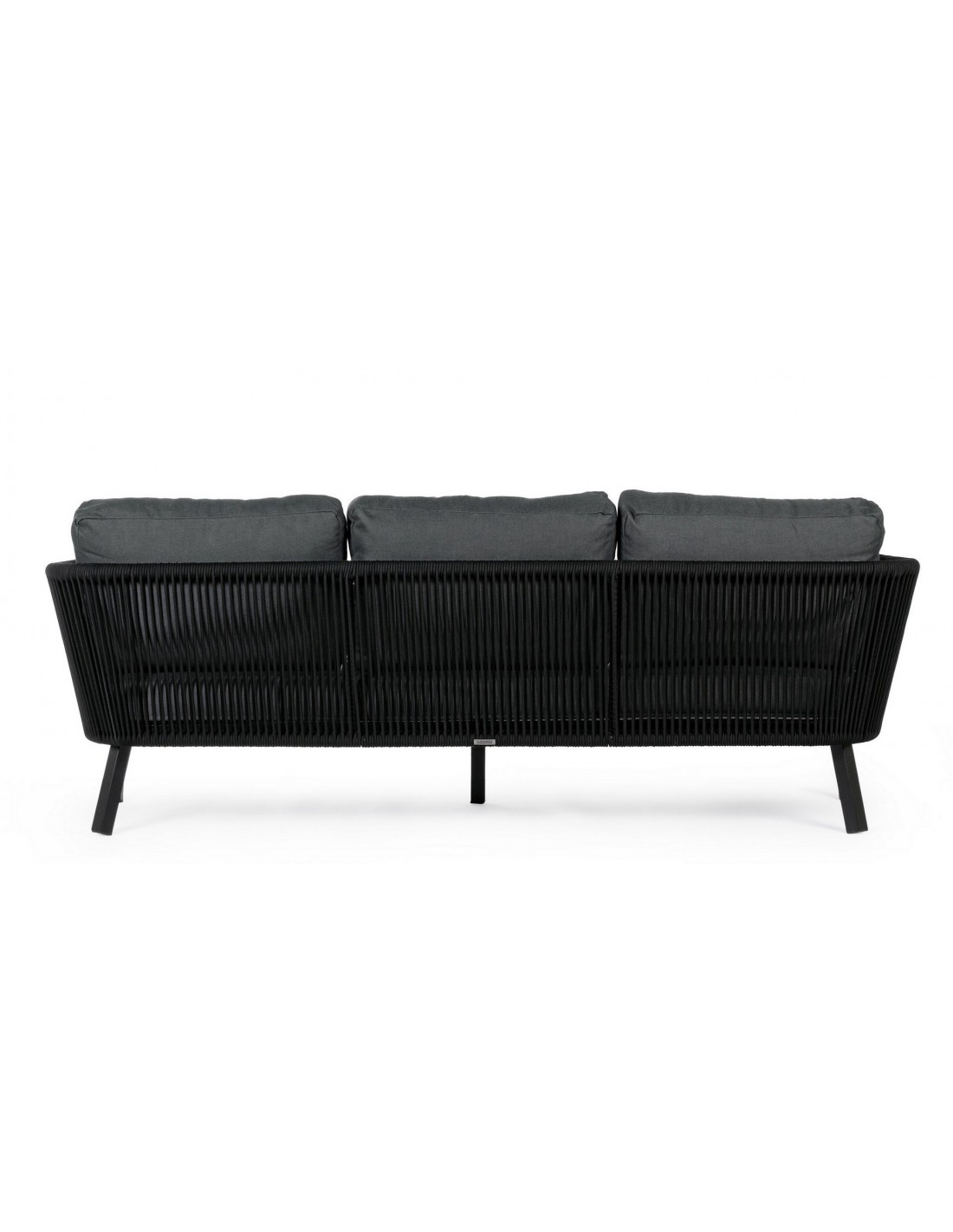 Loungesofa udført i et design af sortlakeret aluminium og teflonbehandlet akryl (Vandafvisende og UV resistent). Dertil hynder i charcoal polyester med aftagelige betræk. Sofaen måler 225 cm i bredden. Møblet tåler regnvejr, men hynder og puder anbefaler vi dog at opbevare indendørs, når møblet ikke er i brug.