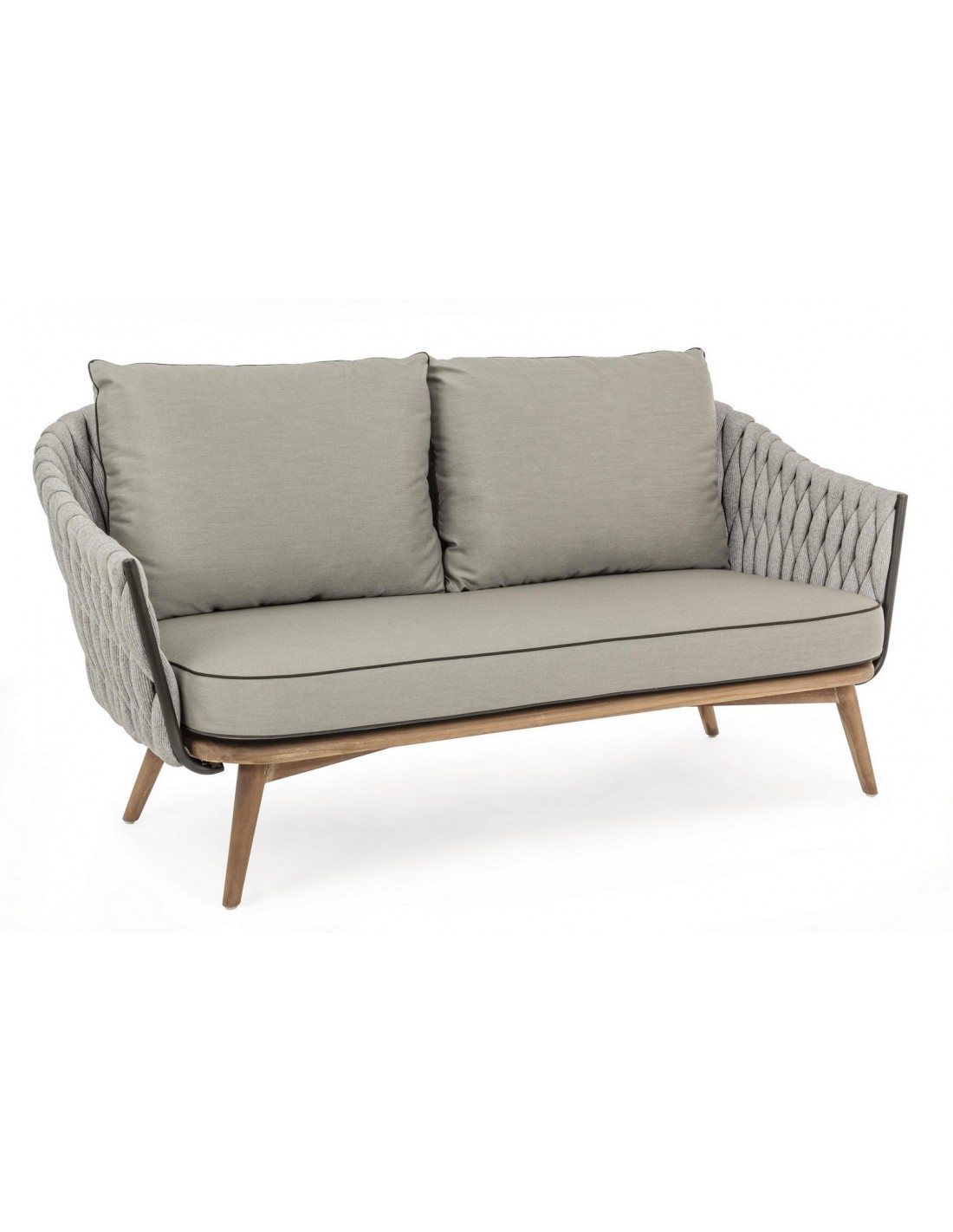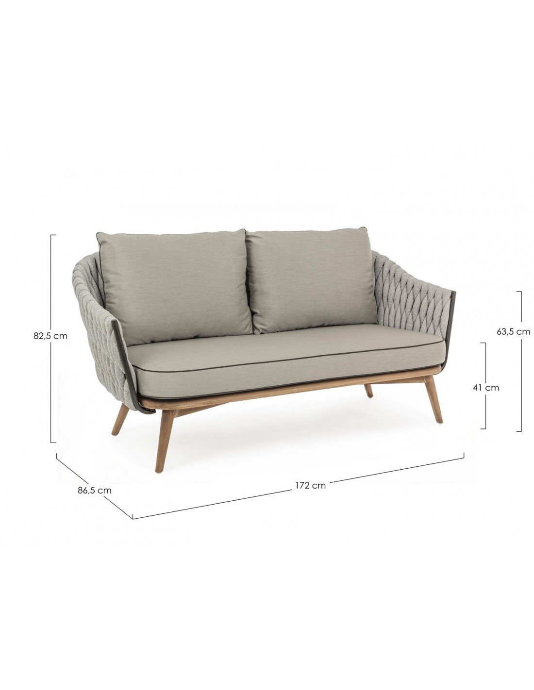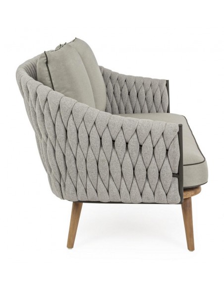 Loungesofa udført i et design af rustikt teaktræ og lakeret aluminium beklædt med UV resistent og vandafvisende hilon med skumfyld. Dertil hynder i UV resistent og vandafvisende akryl. Sofaen måler 172 cm i bredden. Møblet tåler regnvejr, men hynder og puder anbefaler vi dog at opbevare indendørs, når møblet ikke er i brug.