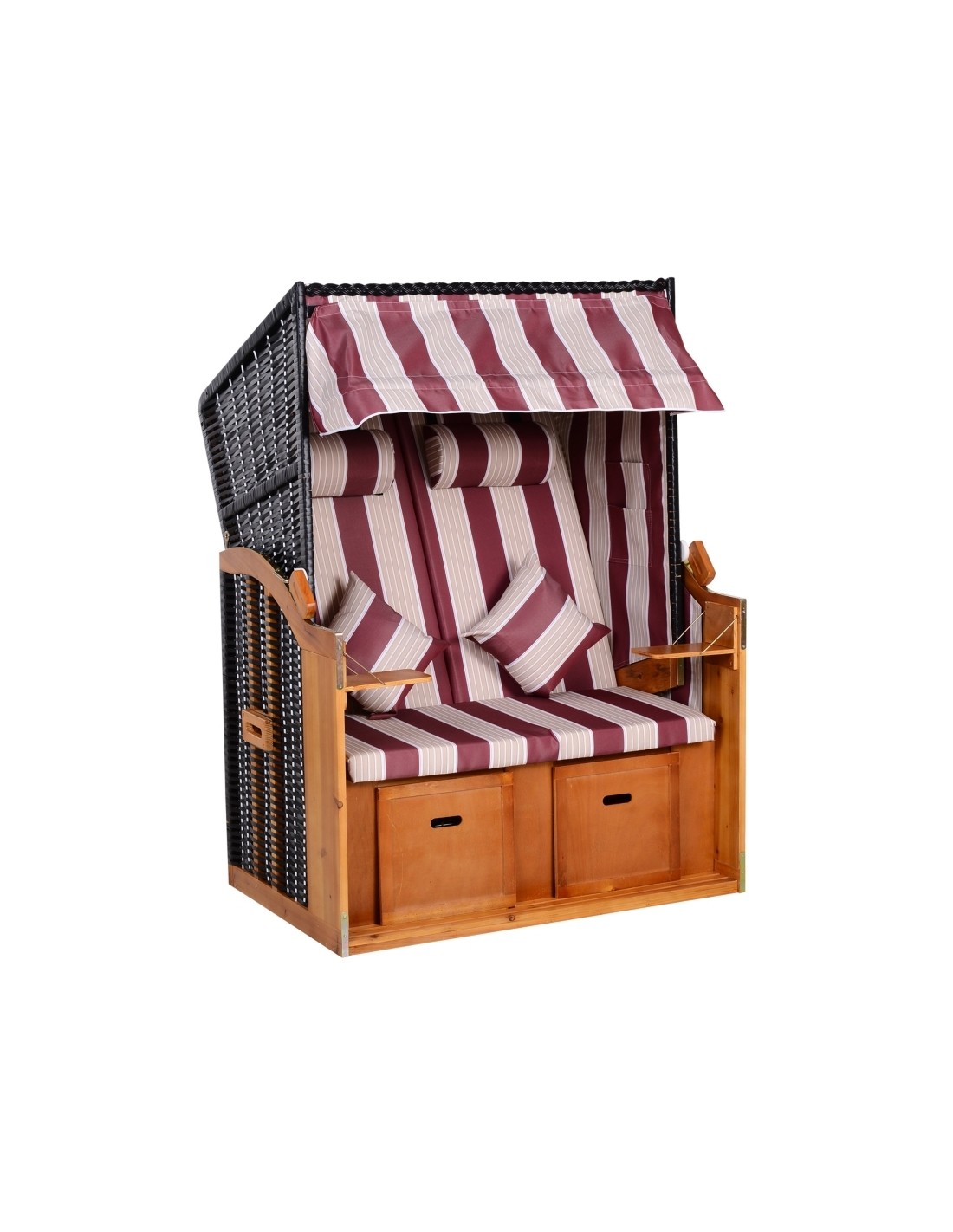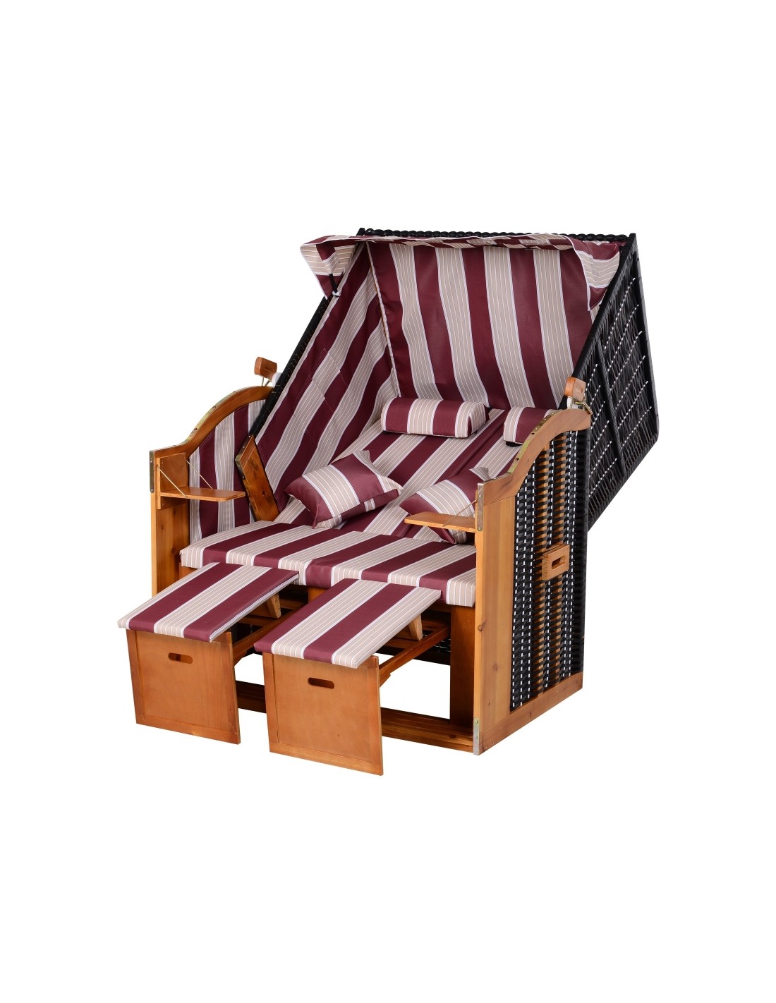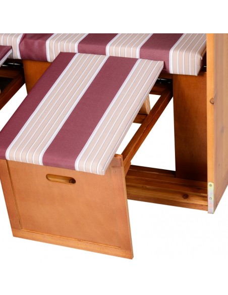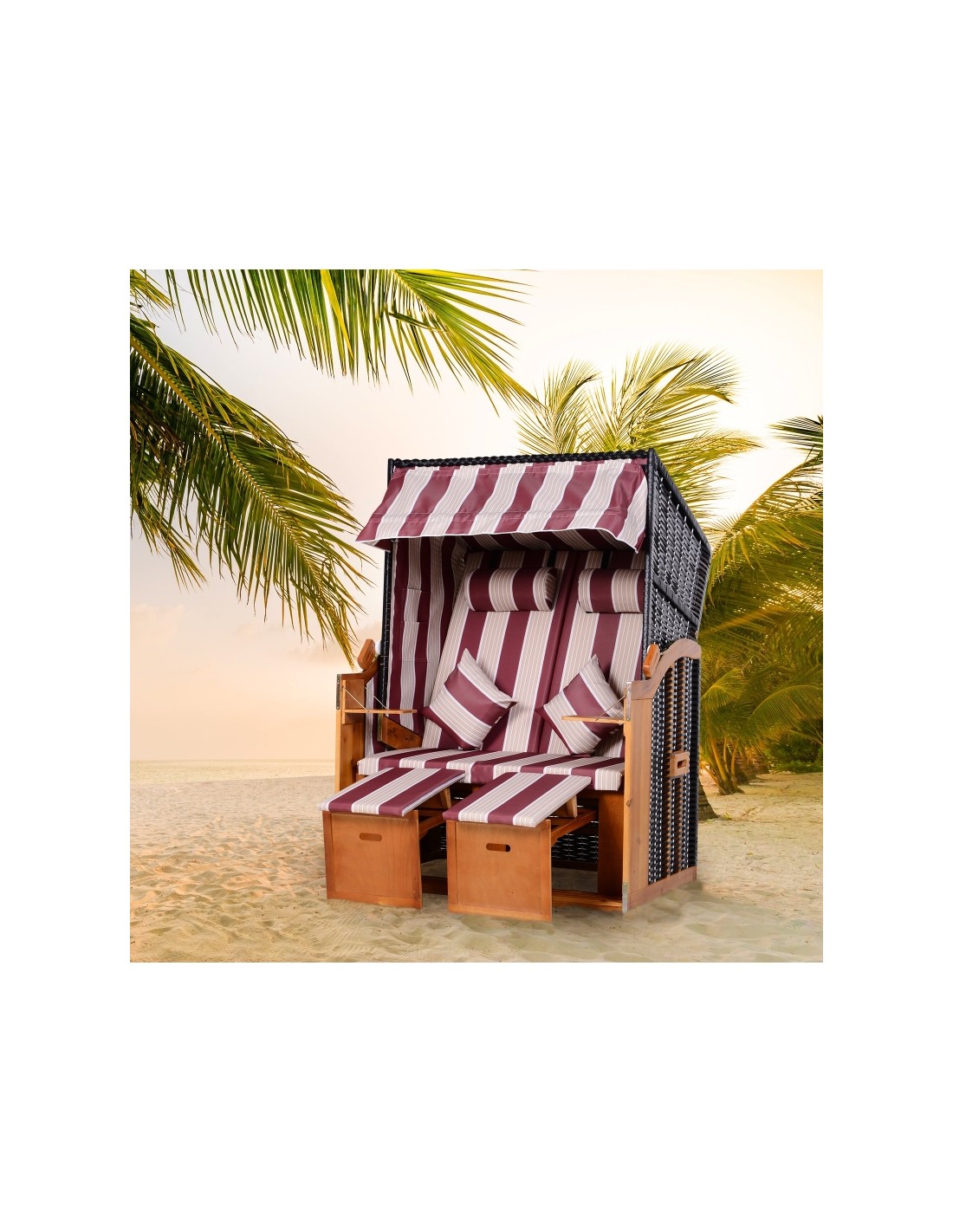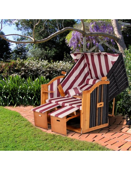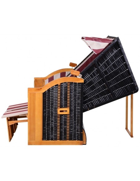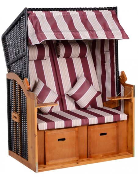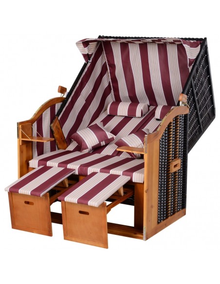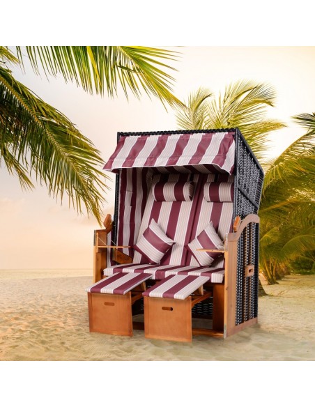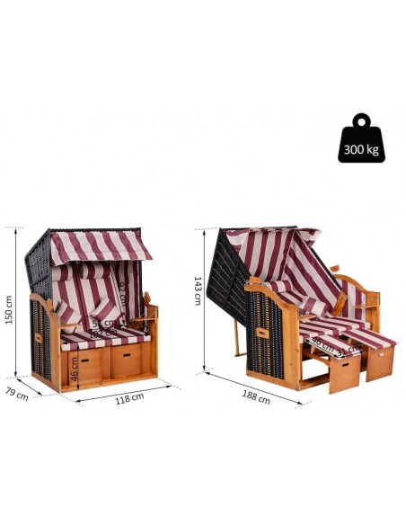 Hollywood loungesofa udført i et design af polyrattan, træ og rød og hvid stribet polyester. Loungesofaen måler 150 cm i højden og 118 cm i bredden. Sofaen kan lægges ned i ryggen og dermed gøres til en liggesofa.