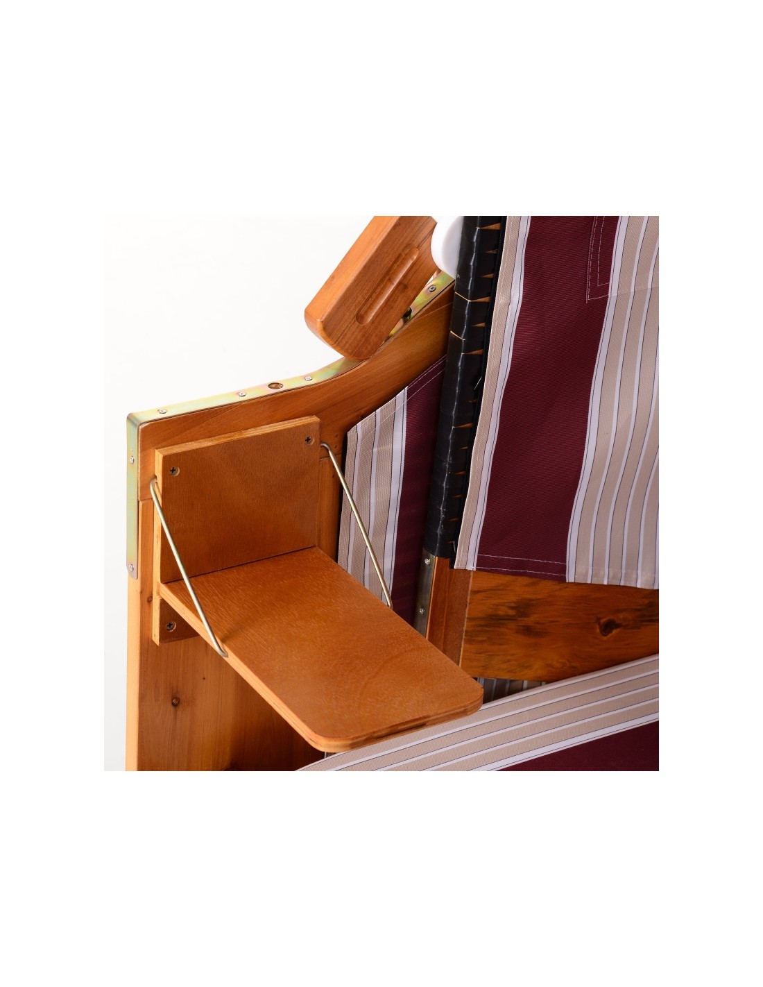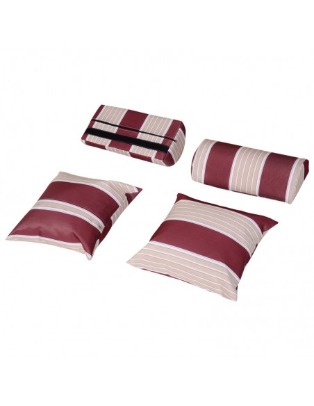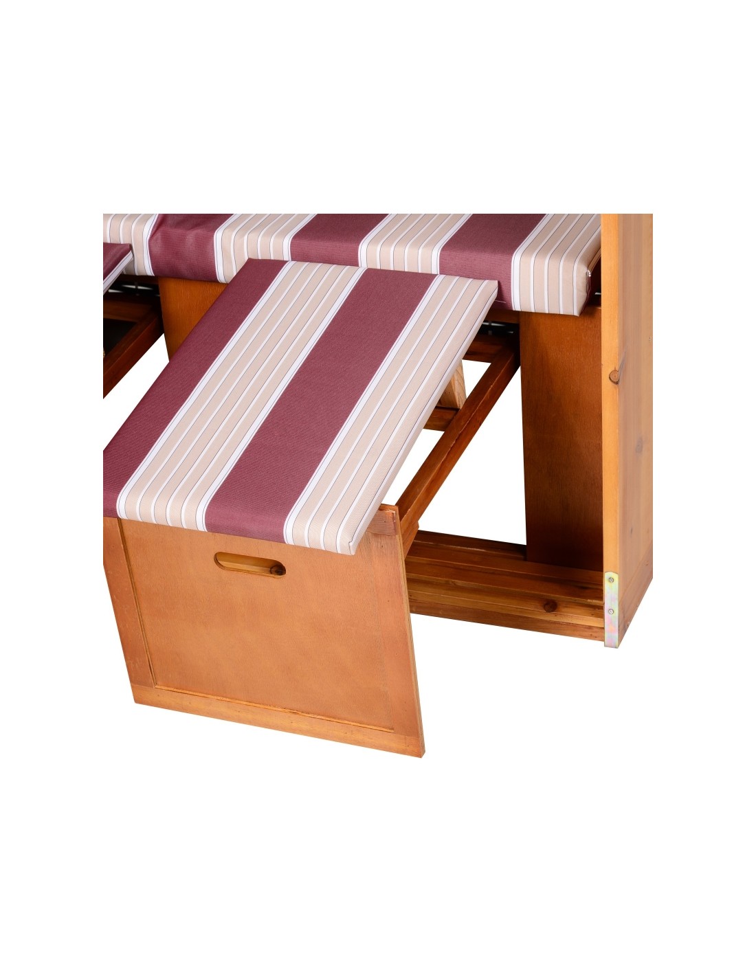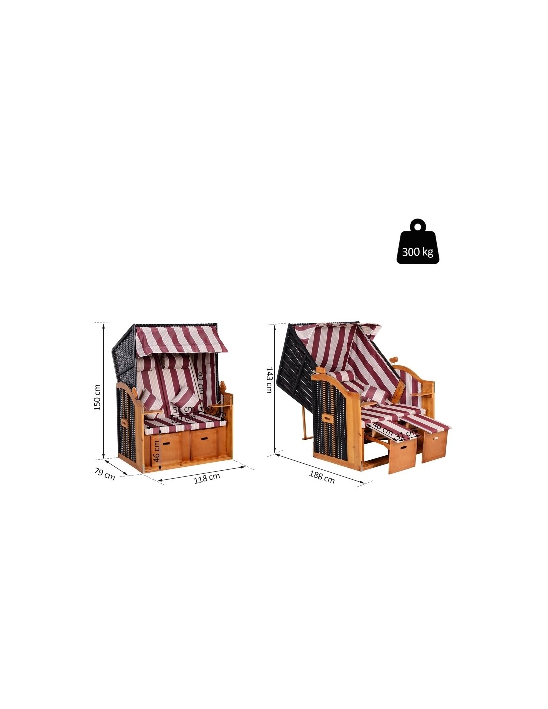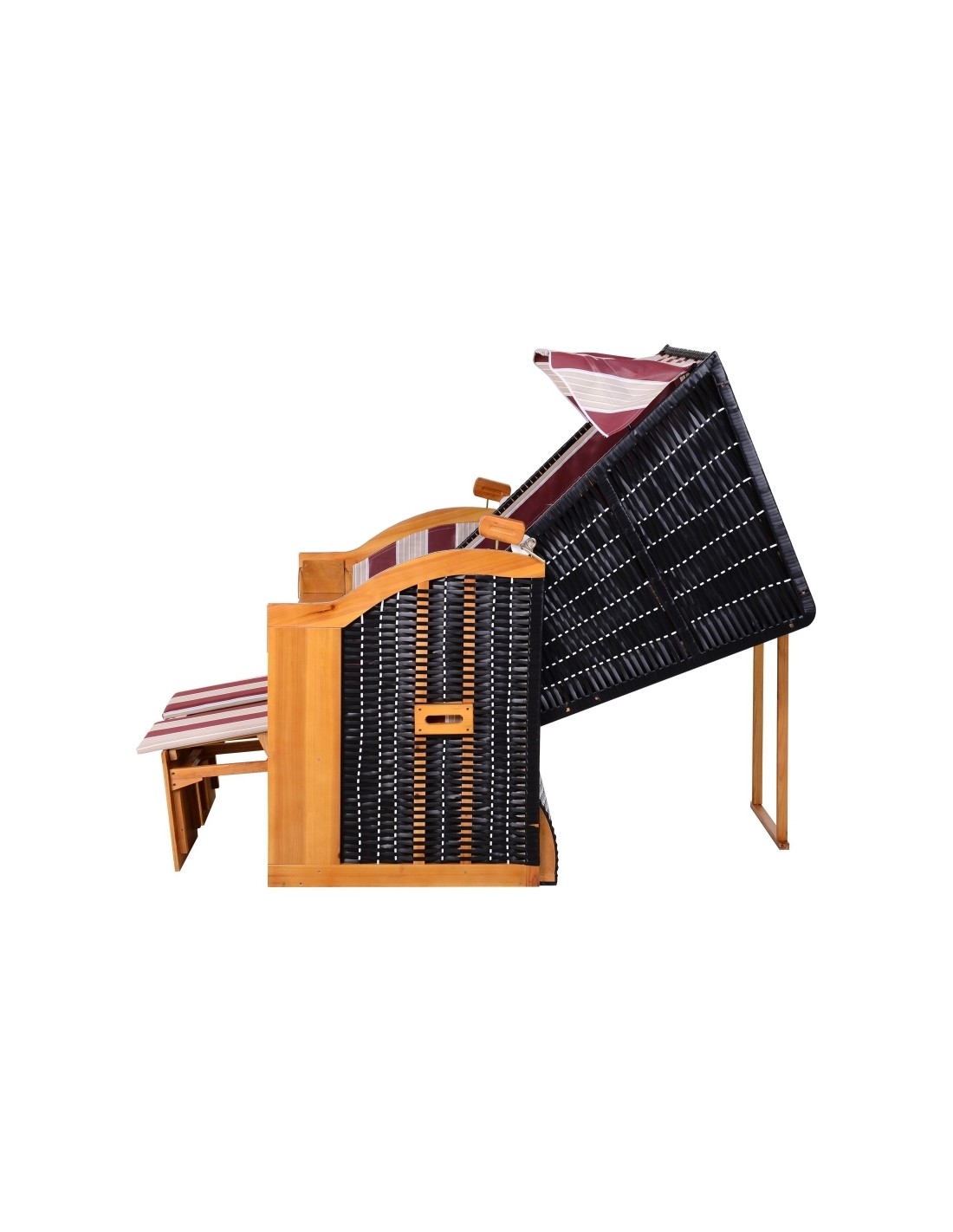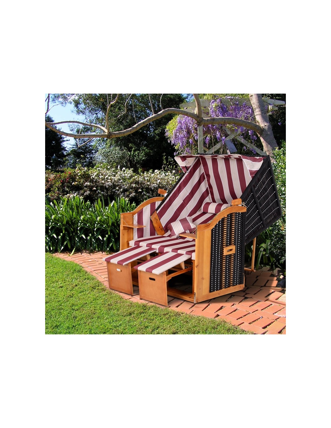 Hollywood loungesofa udført i et design af polyrattan, træ og rød og hvid stribet polyester. Loungesofaen måler 150 cm i højden og 118 cm i bredden. Sofaen kan lægges ned i ryggen og dermed gøres til en liggesofa.