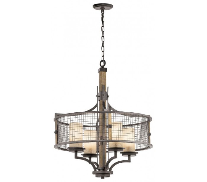 Ahrendale lysekrone i et industrielt design fra amerikanske Kichler. Lampen leveres til europæisk standard til 4 x E27 lyskilder. Lampen måler 61 cm i diameter og er fremstillet i jern, tråd og skærme i glas.