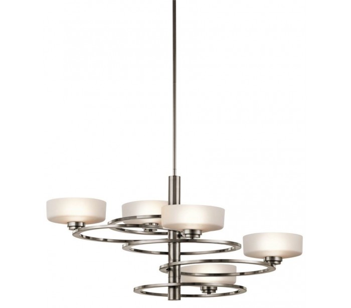 Aleeka lysekrone i et moderne design fra amerikanske Kichler. Lampen leveres til europæisk standard til 5 x G9 lyskilder. Lampen måler 86 cm i diameter og er fremstillet i aluminium og med skærme i glas.